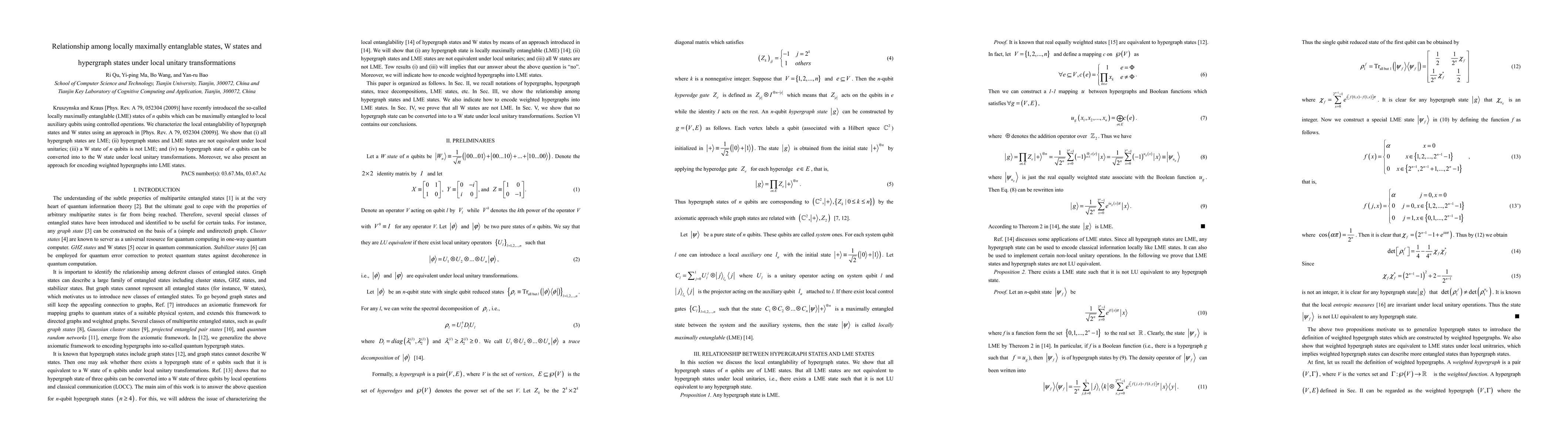 This paper investigates the relationship between locally maximally entanglable (LME) states, W states, and hypergraph states under local unitary transformations. It concludes that all hypergraph states are LME, but neither W states nor hypergraph states are equivalent to LME states under local unitaries, and no hypergraph state can be transformed into a W state via local operations.