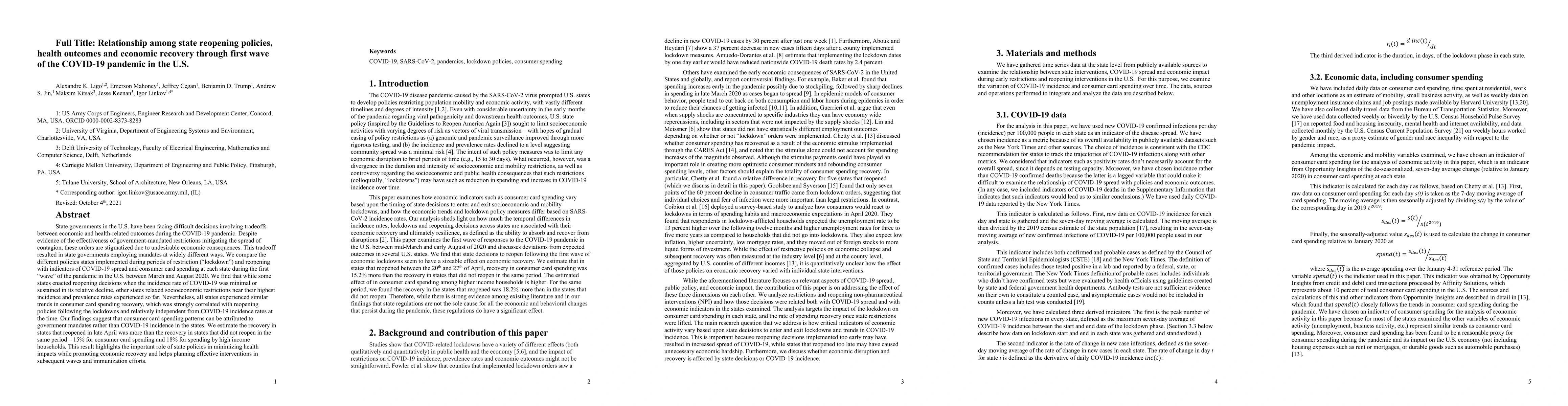 This study examines the relationship between state reopening policies, COVID-19 health outcomes, and economic recovery during the first wave of the pandemic in the U.S. It finds that states with varied reopening strategies experienced similar trends in consumer card spending recovery, which was more strongly correlated with reopening policies than with COVID-19 incidence rates.