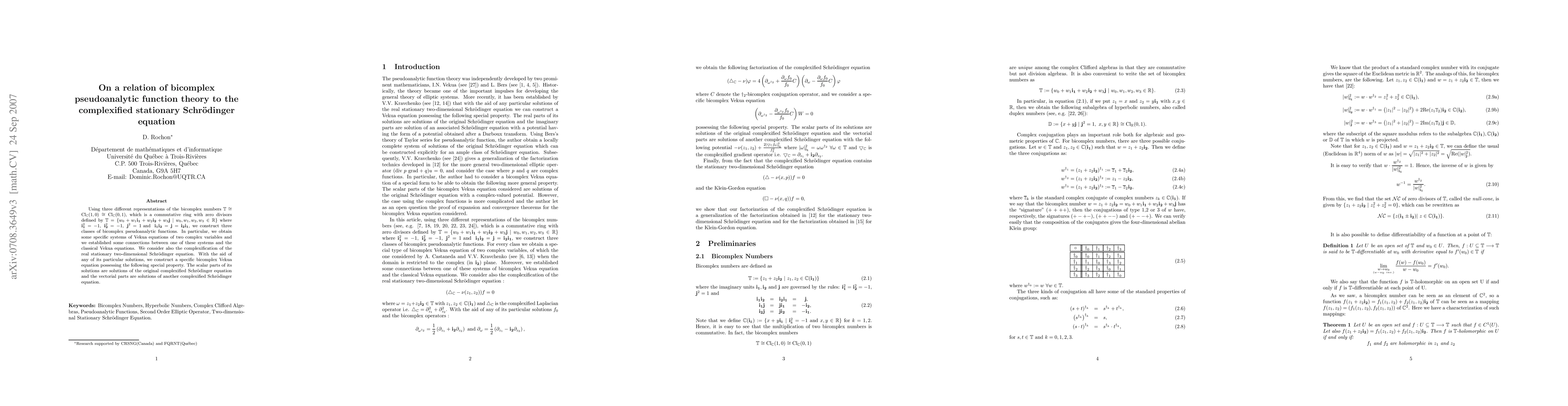 Using three different representations of the bicomplex numbers $T\cong Cl_{C}(1,0) \cong Cl_{C}(0,1)$, which is a commutative ring with zero divisors defined by $T={w_0+w_1 {i_1}+w_2{i_2}+w_3 {j} | w_0,w_1,w_2,w_3 \in{R}}$ where ${i_1^{2}}=-1, {i_2^{2}}=-1, {j^{2}}=1 and {i_1}{i_2}={j}={i_2}{i_1}$, we construct three classes of bicomplex pseudoanalytic functions. In particular, we obtain some specific systems of Vekua equations of two complex variables and we established some connections between one of these systems and the classical Vekua equations. We consider also the complexification of the real stationary two-dimensional Schr{\"o}dinger equation. With the aid of any of its particular solutions, we construct a specific bicomplex Vekua equation possessing the following special property. The scalar parts of its solutions are solutions of the original complexified Schr{\"o}dinger equation and the vectorial parts are solutions of another complexified Schr{\"o}dinger equation.