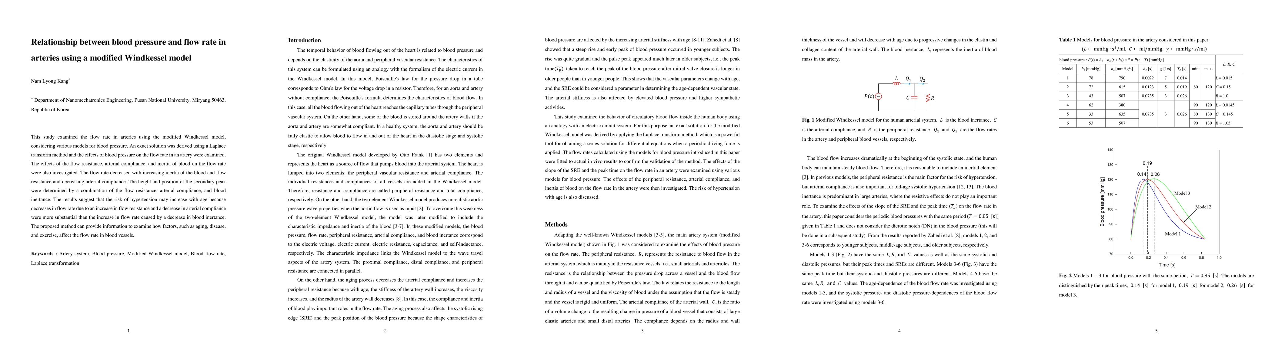 This study uses a modified Windkessel model to analyze the relationship between blood pressure and flow rate in arteries, revealing that flow rate decreases with increased blood inertia and resistance, and decreases with reduced arterial compliance. The method can help assess how aging and other factors impact blood flow dynamics.