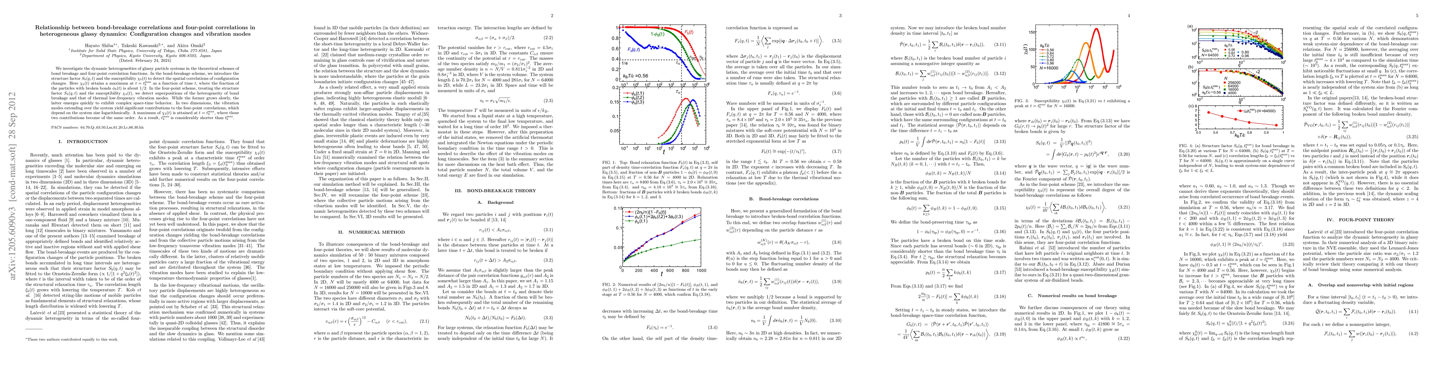 We investigate the dynamic heterogeneities of glassy particle systems in the theoretical schemes of bond breakage and four-point correlation functions. In the bond-breakage scheme, we introduce the structure factor S_b(q,t) and the susceptibility chi_b(t) to detect the spatial correlations of configuration changes. Here chi_b(t) attains a maximum at t =t_b^max as a function of time t, where the fraction of the particles with broken bonds phi_b(t)$ is about 1/2. In the four-point scheme, treating the structure factor S_4(q,t) and the susceptibility chi_4(t), we detect superpositions of the heterogeneity of bond breakage and that of thermal low-frequency vibration modes. While the former grows slowly, the latter emerges quickly to exhibit complex space-time behavior. In two dimensions, the vibration modes extending over the system yield significant contributions to the four-point correlations, which depend on the system size logarithmically. A maximum of chi_4(t) is attained at t= t_4^max, where these two contributions become of the same order. As a result, t_4^max is considerably shorter than t_b^max.