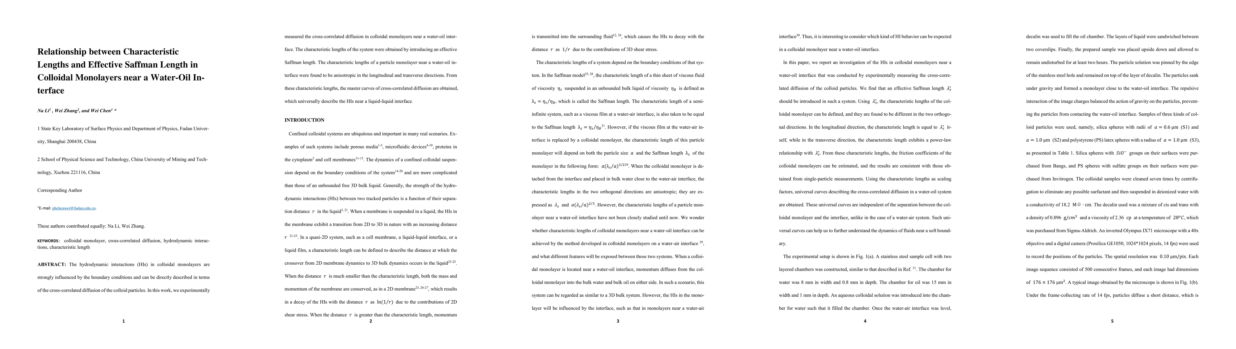 This study experimentally measures the hydrodynamic interactions in colloidal monolayers near a water-oil interface, revealing anisotropic characteristic lengths. An effective Saffman length is introduced to describe these interactions, leading to master curves that universally represent the cross-correlated diffusion and hydrodynamic effects in such systems.