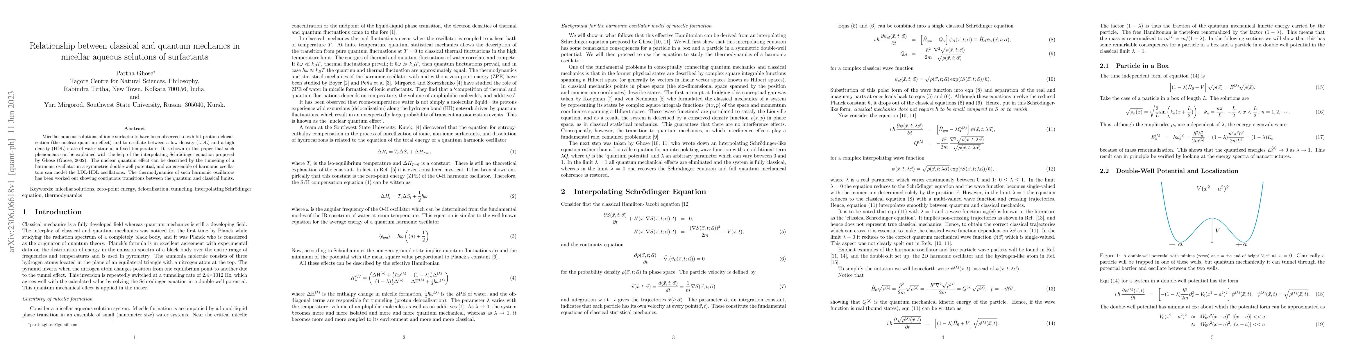 This paper explores the relationship between classical and quantum mechanics in micellar aqueous solutions of surfactants, demonstrating proton delocalization and density oscillations using Ghose's interpolating Schrödinger equation. It models these phenomena with harmonic oscillators, showing continuous transitions between quantum and classical thermodynamic states.
