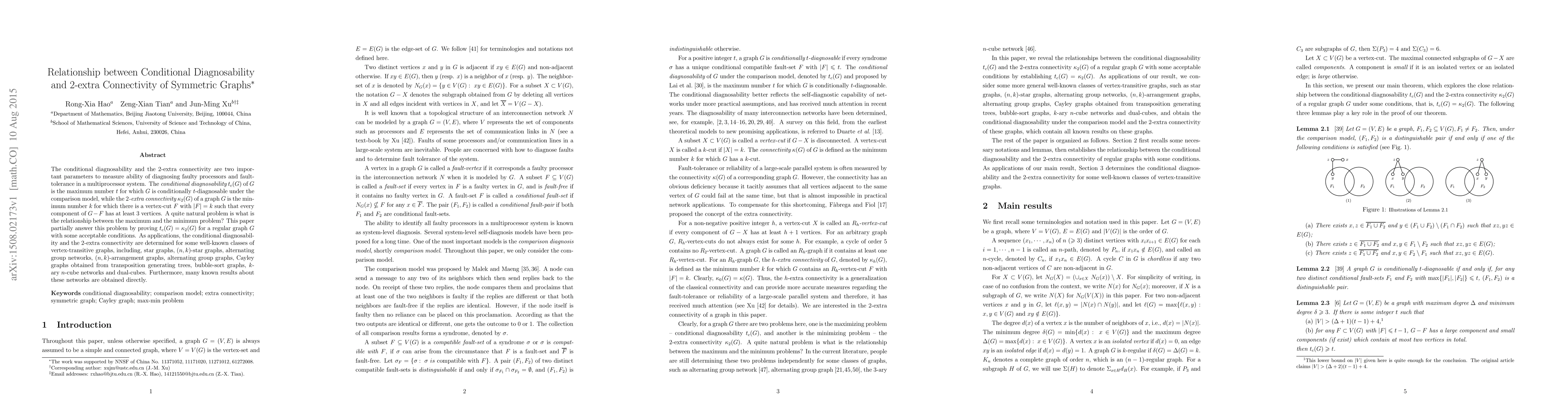 The conditional diagnosability and the 2-extra connectivity are two important parameters to measure ability of diagnosing faulty processors and fault-tolerance in a multiprocessor system. The conditional diagnosability $t_c(G)$ of $G$ is the maximum number $t$ for which $G$ is conditionally $t$-diagnosable under the comparison model, while the 2-extra connectivity $\kappa_2(G)$ of a graph $G$ is the minimum number $k$ for which there is a vertex-cut $F$ with $|F|=k$ such that every component of $G-F$ has at least $3$ vertices. A quite natural problem is what is the relationship between the maximum and the minimum problem? This paper partially answer this problem by proving $t_c(G)=\kappa_2(G)$ for a regular graph $G$ with some acceptable conditions. As applications, the conditional diagnosability and the 2-extra connectivity are determined for some well-known classes of vertex-transitive graphs, including, star graphs, $(n,k)$-star graphs, alternating group networks, $(n,k)$-arrangement graphs, alternating group graphs, Cayley graphs obtained from transposition generating trees, bubble-sort graphs, $k$-ary $n$-cube networks and dual-cubes. Furthermore, many known results about these networks are obtained directly.