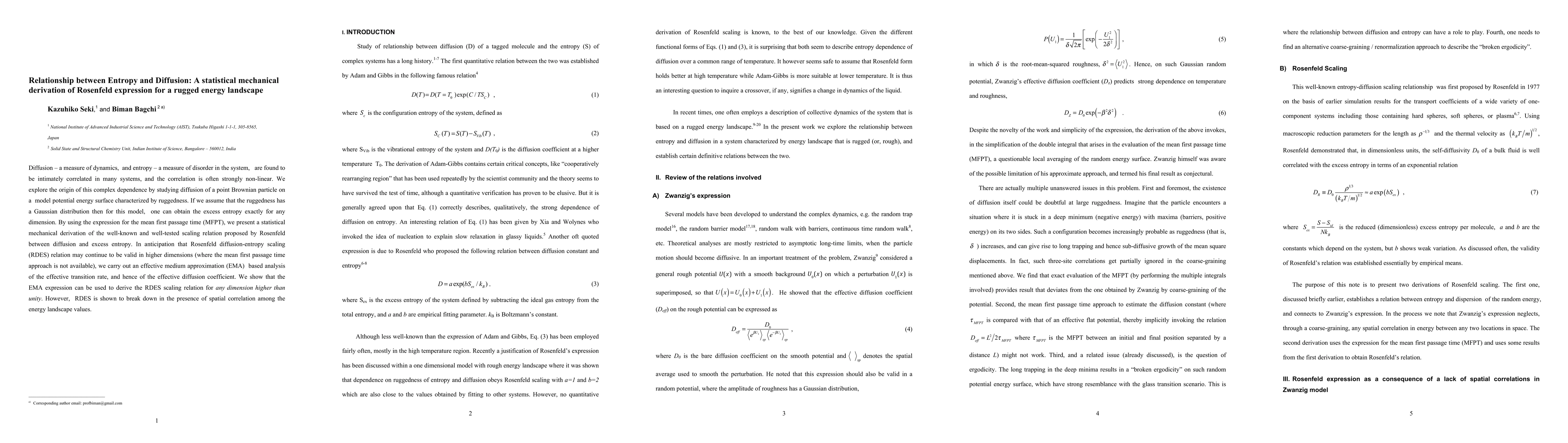 This research derives Rosenfeld's diffusion-entropy scaling relation using a statistical mechanical approach for a rugged energy landscape model with Gaussian distributed ruggedness. The study extends this relation to higher dimensions via an effective medium approximation, but notes its breakdown with spatial correlation in the energy landscape values.