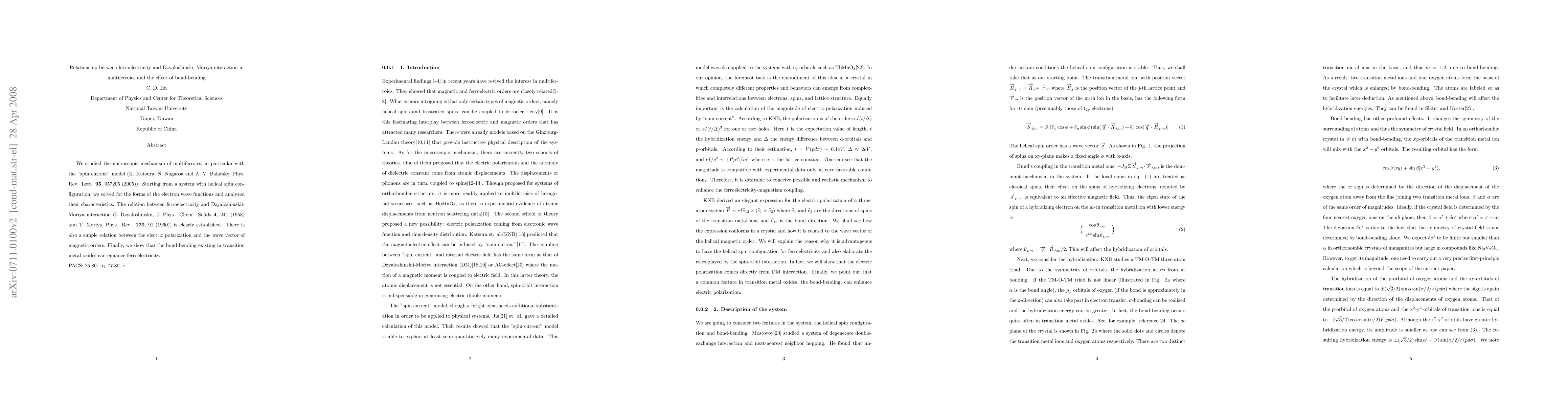 We studied the microscopic mechanism of multiferroics, in particular with the "spin current" model (Hosho Katsura, Naoto Nagaosa and Aleander V. Balatsky, Phys. Rev. Lett. 95, 057205 (2005)). Starting from a system with helical spin configuration, we solved for the forms of the electron wave functions and analyzed their characteristics. The relation between ferroelectricity and Dzyaloshinskii-Moriya interaction (I. Dzyaloshinskii, J. Phys. Chem. Solids 4, 241 (1958) and T. Moriya, Phys. Rev. 120, 91 (1960)) is clearly established. There is also a simple relation between the electric polarization and the wave vector of magnetic orders. Finally, we show that the bond-bending exists in transition metal oxides can enhance ferroelectricity.