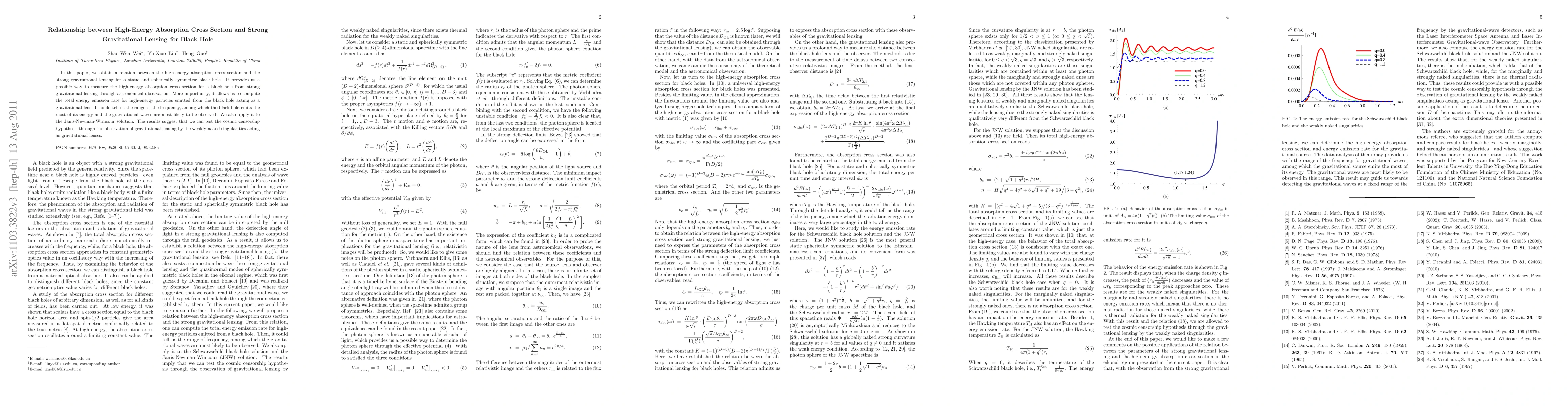 In this paper, we obtain a relation between the high-energy absorption cross section and the strong gravitational lensing for a static and spherically symmetric black hole. It provides us a possible way to measure the high-energy absorption cross section for a black hole from strong gravitational lensing through astronomical observation. More importantly, it allows us to compute the total energy emission rate for high-energy particles emitted from the black hole acting as a gravitational lens. It could tell us the range of the frequency, among which the black hole emits the most of its energy and the gravitational waves are most likely to be observed. We also apply it to the Janis-Newman-Winicour solution. The results suggest that we can test the cosmic censorship hypothesis through the observation of gravitational lensing by the weakly naked singularities acting as gravitational lenses.