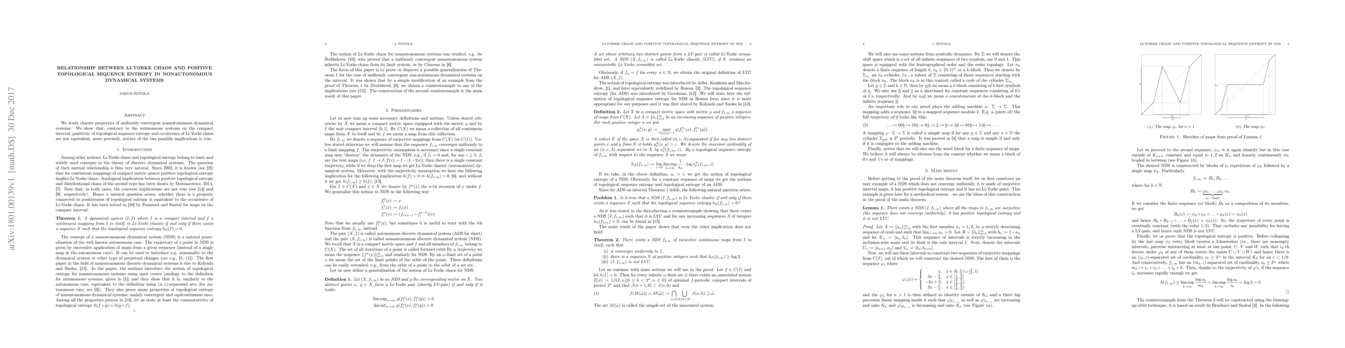 Summary: This paper investigates chaotic behaviors in nonautonomous dynamical systems, revealing that Li-Yorke chaos and positive topological sequence entropy are not equivalent in these systems, unlike in autonomous systems, disproving both possible implications between them.
