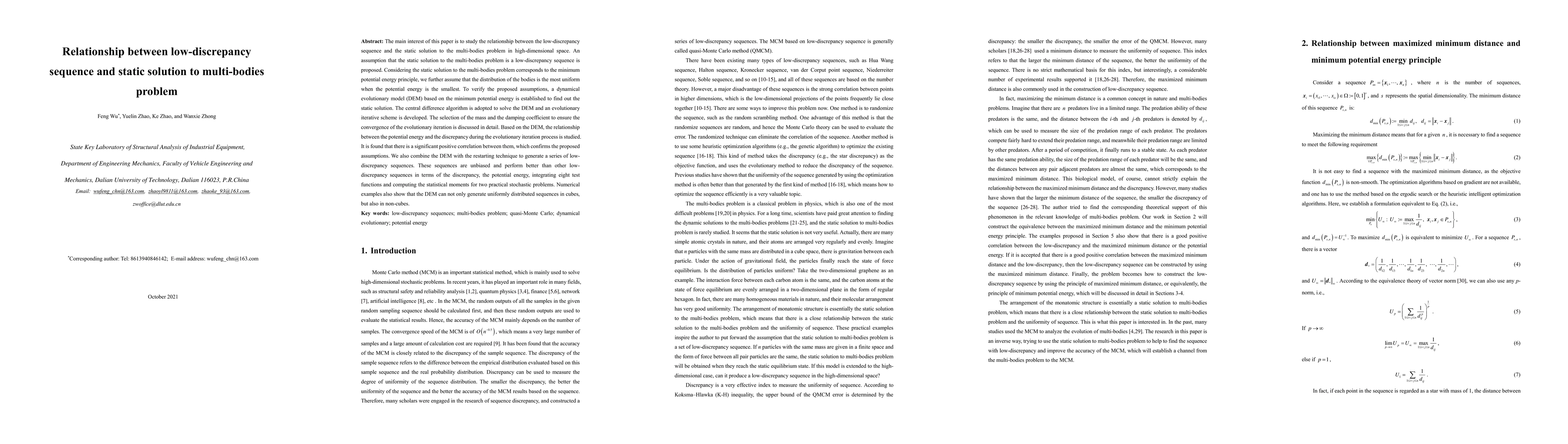 The main interest of this paper is to study the relationship between the low-discrepancy sequence and the static solution to the multi-bodies problem in high-dimensional space. An assumption that the static solution to the multi-bodies problem is a low-discrepancy sequence is proposed. Considering the static solution to the multi-bodies problem corresponds to the minimum potential energy principle, we further assume that the distribution of the bodies is the most uniform when the potential energy is the smallest. To verify the proposed assumptions, a dynamical evolutionary model (DEM) based on the minimum potential energy is established to find out the static solution. The central difference algorithm is adopted to solve the DEM and an evolutionary iterative scheme is developed. The selection of the mass and the damping coefficient to ensure the convergence of the evolutionary iteration is discussed in detail. Based on the DEM, the relationship between the potential energy and the discrepancy during the evolutionary iteration process is studied. It is found that there is a significant positive correlation between them, which confirms the proposed assumptions. We also combine the DEM with the restarting technique to generate a series of low-discrepancy sequences. These sequences are unbiased and perform better than other low-discrepancy sequences in terms of the discrepancy, the potential energy, integrating eight test functions and computing the statistical moments for two practical stochastic problems. Numerical examples also show that the DEM can not only generate uniformly distributed sequences in cubes, but also in non-cubes.