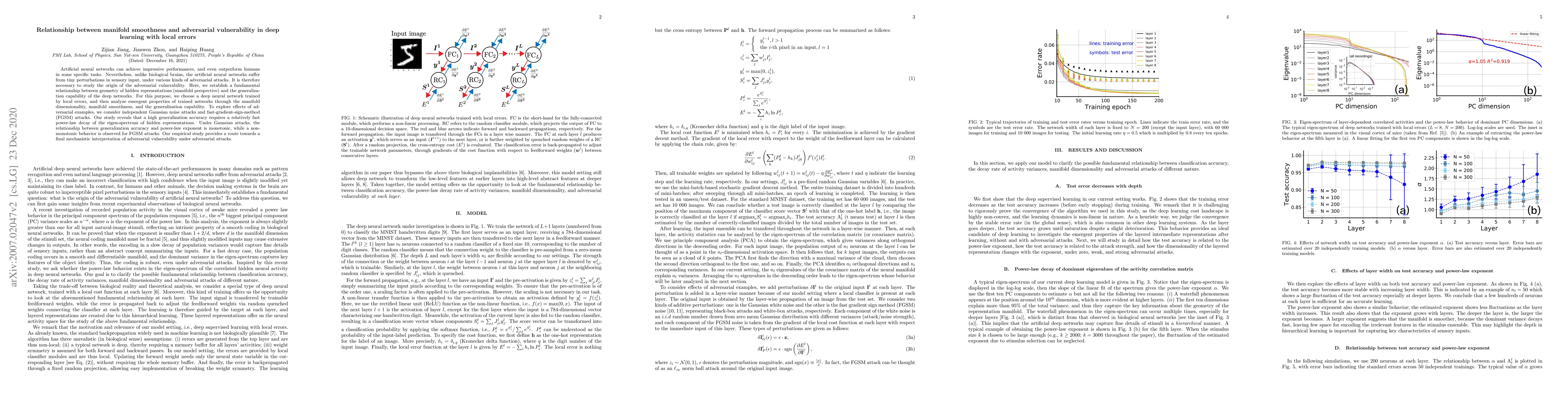 Artificial neural networks can achieve impressive performances, and even outperform humans in some specific tasks. Nevertheless, unlike biological brains, the artificial neural networks suffer from tiny perturbations in sensory input, under various kinds of adversarial attacks. It is therefore necessary to study the origin of the adversarial vulnerability. Here, we establish a fundamental relationship between geometry of hidden representations (manifold perspective) and the generalization capability of the deep networks. For this purpose, we choose a deep neural network trained by local errors, and then analyze emergent properties of trained networks through the manifold dimensionality, manifold smoothness, and the generalization capability. To explore effects of adversarial examples, we consider independent Gaussian noise attacks and fast-gradient-sign-method (FGSM) attacks. Our study reveals that a high generalization accuracy requires a relatively fast power-law decay of the eigen-spectrum of hidden representations. Under Gaussian attacks, the relationship between generalization accuracy and power-law exponent is monotonic, while a non-monotonic behavior is observed for FGSM attacks. Our empirical study provides a route towards a final mechanistic interpretation of adversarial vulnerability under adversarial attacks.