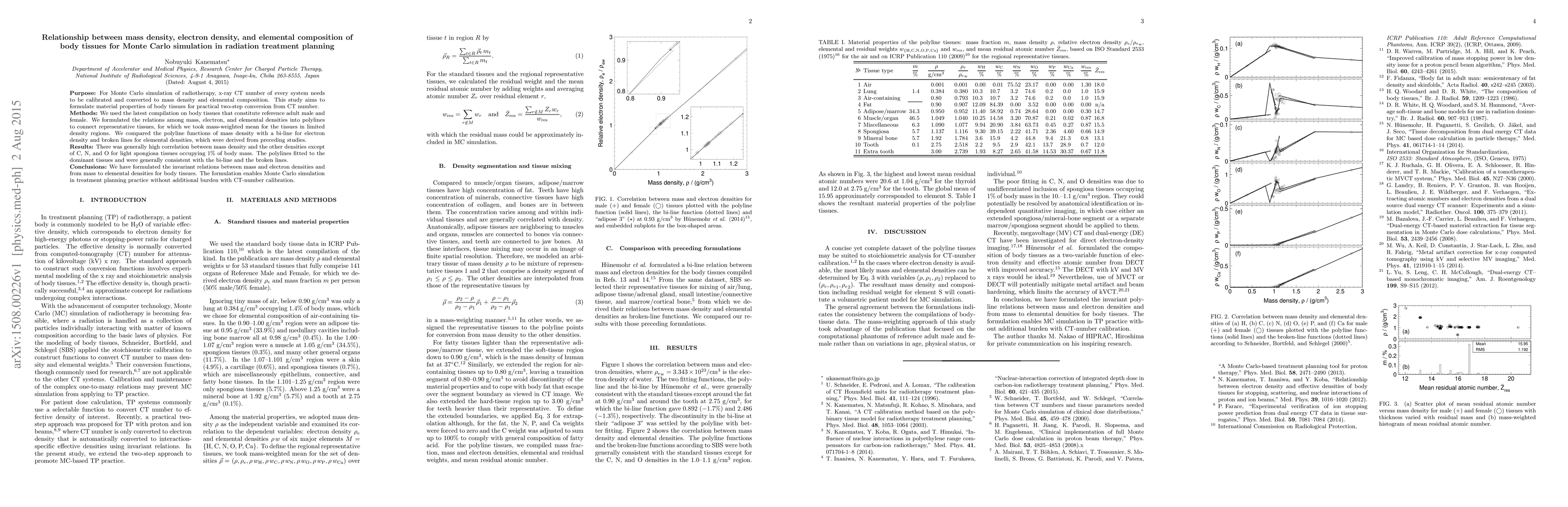 This study formulates material properties for body tissues to convert CT numbers into mass density and elemental composition for Monte Carlo simulation in radiotherapy. The relations among mass, electron, and elemental densities were modeled using polylines, showing high correlation except for light spongiosa tissues, thus facilitating practical treatment planning.