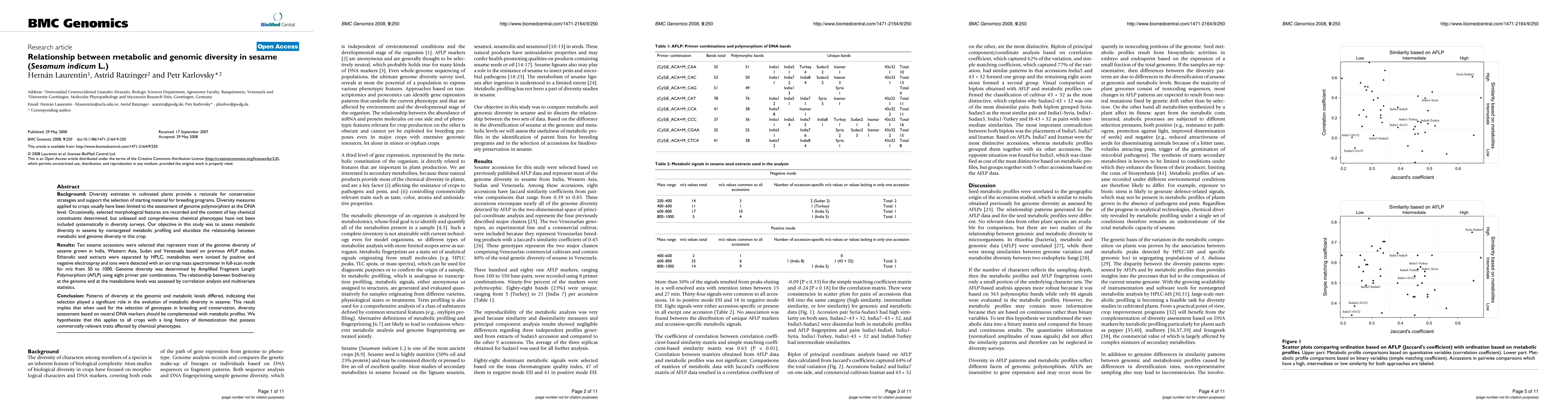 Background: Diversity estimates in cultivated plants provide a rationale for conservation strategies and support the selection of starting material for breeding programs. Diversity measures applied to crops usually have been limited to the assessment of genome polymorphism at the DNA level. Occasionally, selected morphological features are recorded and the content of key chemical constituents determined, but unbiased and comprehensive chemical phenotypes have not been included systematically in diversity surveys. Our objective in this study was to assess metabolic diversity in sesame by nontargeted metabolic profiling and elucidate the relationship between metabolic and genome diversity in this crop. Results: Ten sesame accessions were selected that represent most of the genome diversity of sesame grown in India, Western Asia, Sudan and Venezuela based on previous AFLP studies. Ethanolic seed extracts were separated by HPLC, metabolites were ionized by positive and negative electrospray and ions were detected with an ion trap mass spectrometer in full-scan mode for m/z from 50 to 1000. Genome diversity was determined by Amplified Fragment Length Polymorphism (AFLP) using eight primer pair combinations. The relationship between biodiversity at the genome and at the metabolome levels was assessed by correlation analysis and multivariate statistics. Conclusion: Patterns of diversity at the genomic and metabolic levels differed, indicating that selection played a significant role in the evolution of metabolic diversity in sesame. This result implies that when used for the selection of genotypes in breeding and conservation, diversity assessment based on neutral DNA markers should be complemented with metabolic profiles. We hypothesize that this applies to all crops with a long history of domestication that possess commercially relevant traits affected by chemical phenotypes.