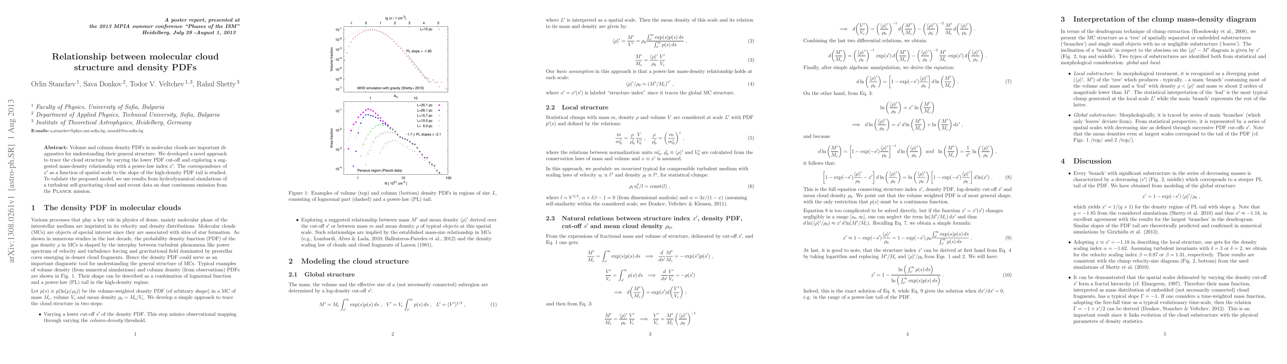 This paper develops a novel approach to trace the structure of molecular clouds by analyzing volume and column density PDFs, focusing on the mass-density relationship with a power-law index. The study validates the model using hydrodynamical simulations and Planck mission data.