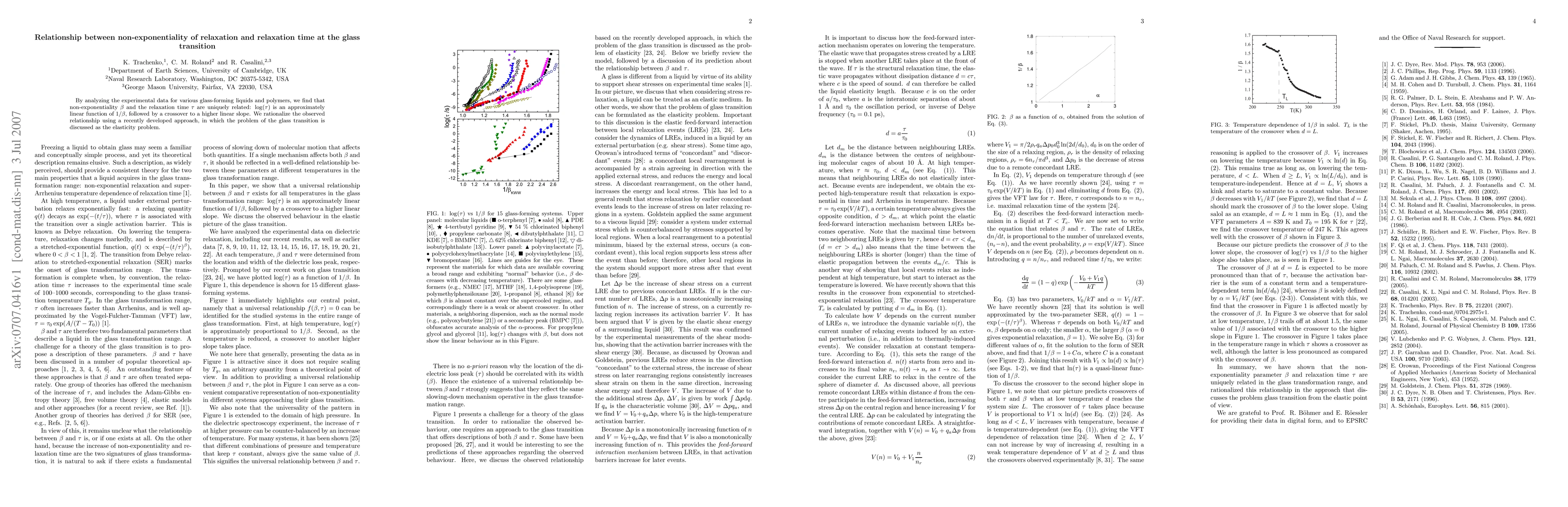 The study analyzed experimental data from various glass-forming liquids and polymers, focusing on the relationship between non-exponentiality $\beta$ and relaxation time $\tau$ at the glass transition.