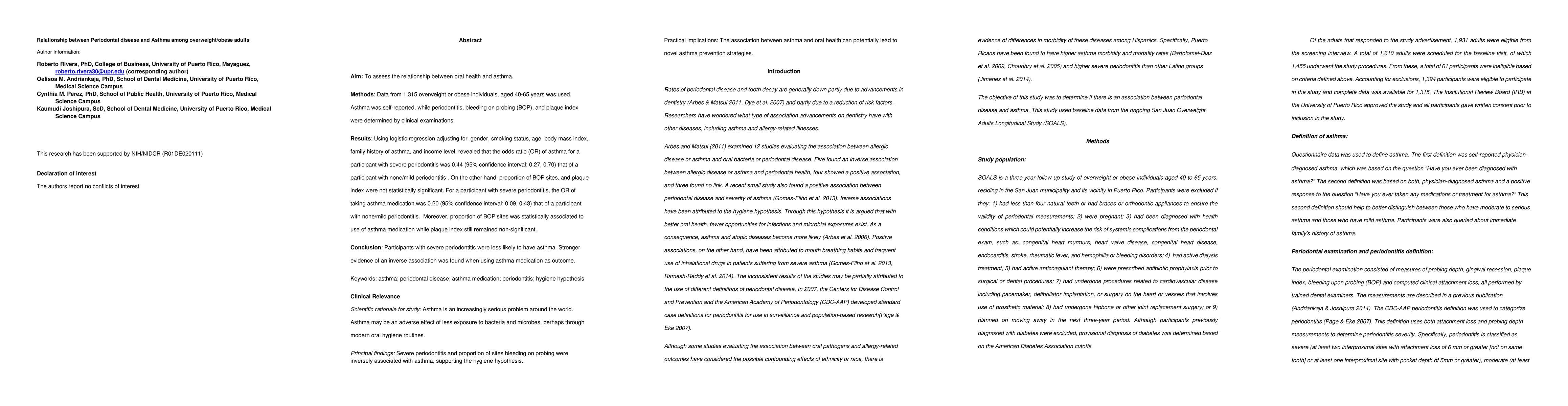 Aim: To assess the relationship between oral health and asthma. Methods: Data from 1,315 overweight or obese individuals, aged 40-65 years was used. Asthma was self-reported, while periodontitis, bleeding on probing (BOP), and plaque index were determined by clinical examinations. Results: Using logistic regression adjusting for gender, smoking status, age, body mass index, family history of asthma, and income level, revealed that the odds ratio (OR) of asthma for a participant with severe periodontitis was 0.44 (95% confidence interval: 0.27, 0.70) that of a participant with none/mild periodontitis . On the other hand, proportion of BOP sites, and plaque index were not statistically significant. For a participant with severe periodontitis, the OR of taking asthma medication was 0.20 (95% confidence interval: 0.09, 0.43) that of a participant with none/mild periodontitis. Moreover, proportion of BOP sites was statistically associated to use of asthma medication while plaque index still remained non-significant. Conclusion: Participants with severe periodontitis were less likely to have asthma. Stronger evidence of an inverse association was found when using asthma medication as outcome. Keywords: asthma; periodontal disease; asthma medication; periodontitis; hygiene hypothesis