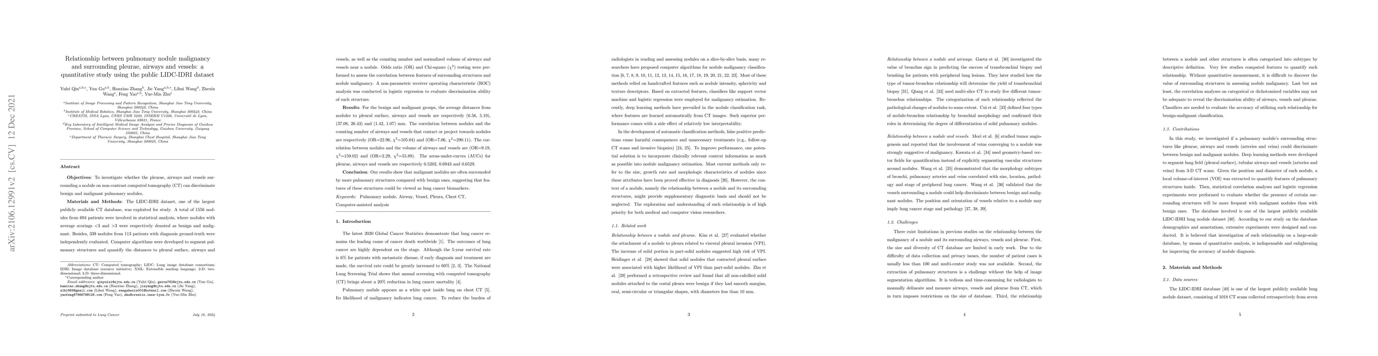 This study uses the LIDC-IDRI dataset to analyze the relationship between pulmonary nodule malignancy and surrounding pleurae, airways, and vessels, finding that malignant nodules are closer and surrounded by more pulmonary structures than benign nodules. The study suggests these structural features could serve as biomarkers for lung cancer.