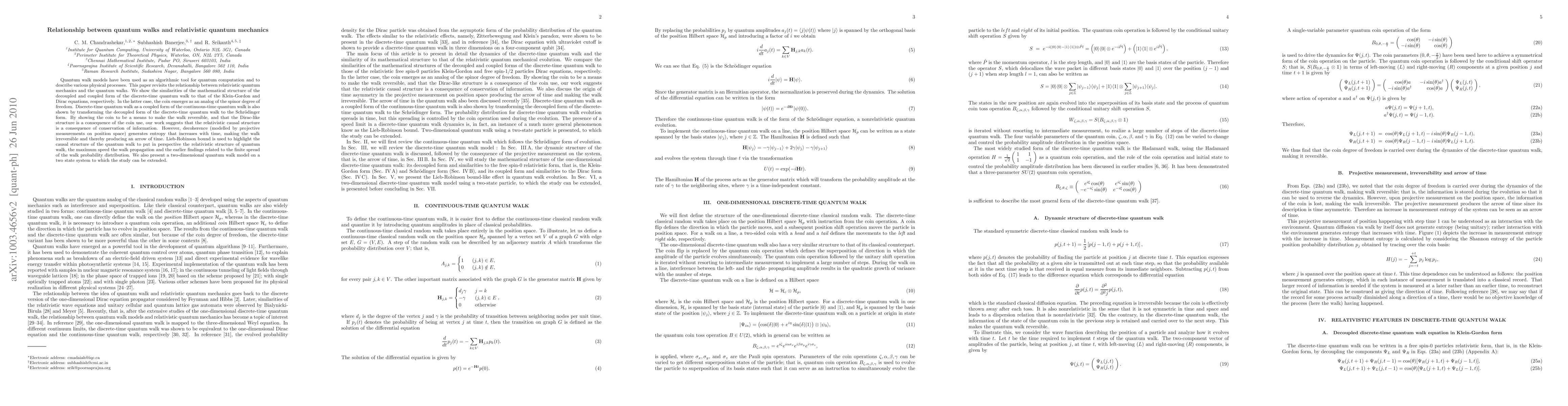 This paper explores the mathematical parallels between relativistic quantum mechanics and quantum walks, showing that discrete-time quantum walks resemble the Klein-Gordon and Dirac equations. The coin in the quantum walk model acts as an analog to the spinor degree of freedom, highlighting the role of information conservation in maintaining relativistic causal structure.