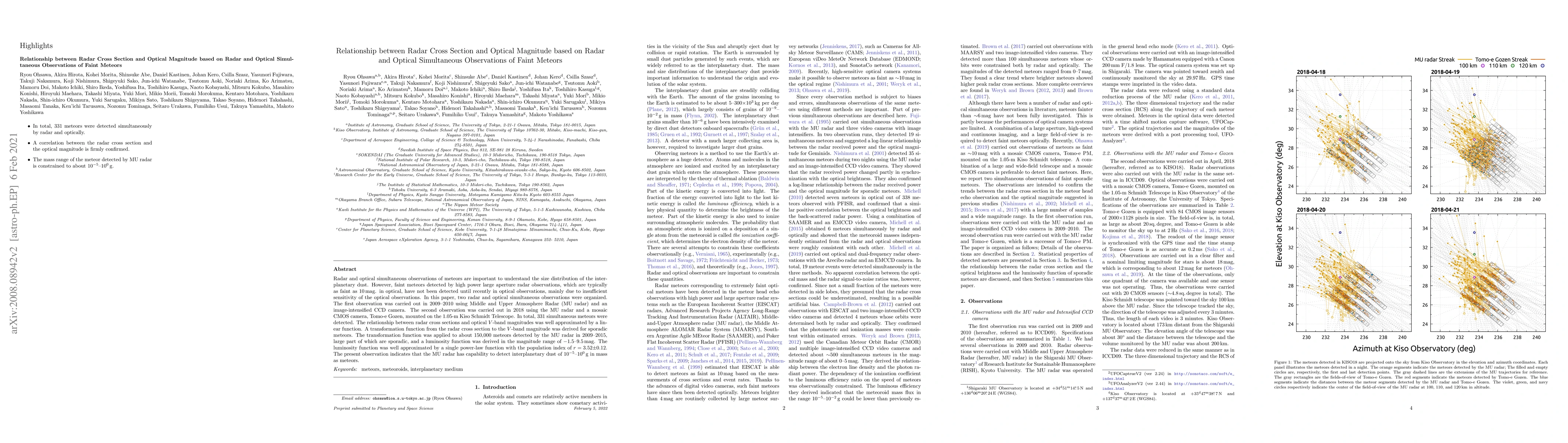 This paper investigates the relationship between radar cross section and optical magnitude through simultaneous radar and optical observations of faint meteors. The study, conducted in 2009-2010 and 2018, detected 331 meteors and derived a linear transformation function from radar cross section to optical V-band magnitude, revealing a power-law luminosity function for sporadic meteors.