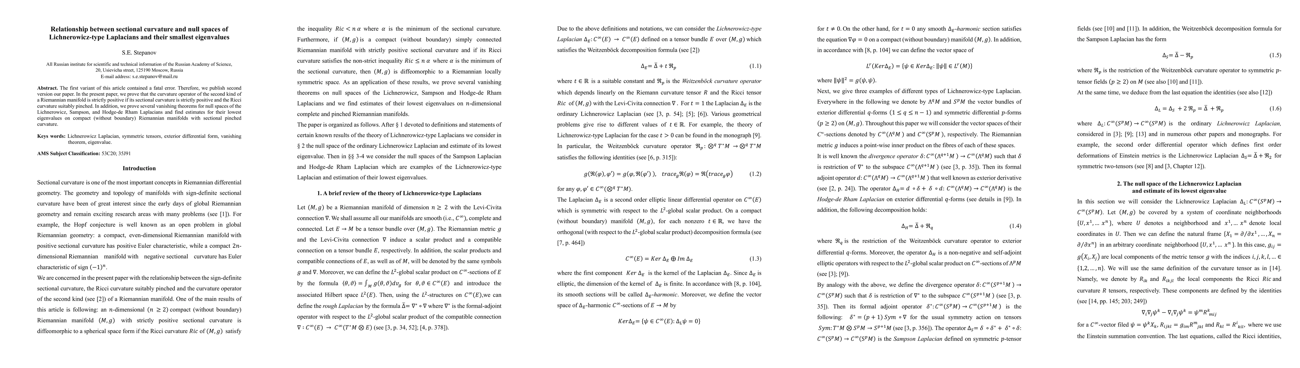 The first variant of this article contained a fatal error. Therefore, we publish second version our paper. In the present paper, we prove that the curvature operator of the second kind of a Riemannian manifold is strictly positive if its sectional curvature is strictly positive and the Ricci curvature suitably pinched. In addition, we prove several vanishing theorems for null spaces of the Lichnerowicz, Sampson, and Hodge-de Rham Laplacians and find estimates for their lowest eigenvalues on compact (without boundary) Riemannian manifolds with sectional pinched curvature.