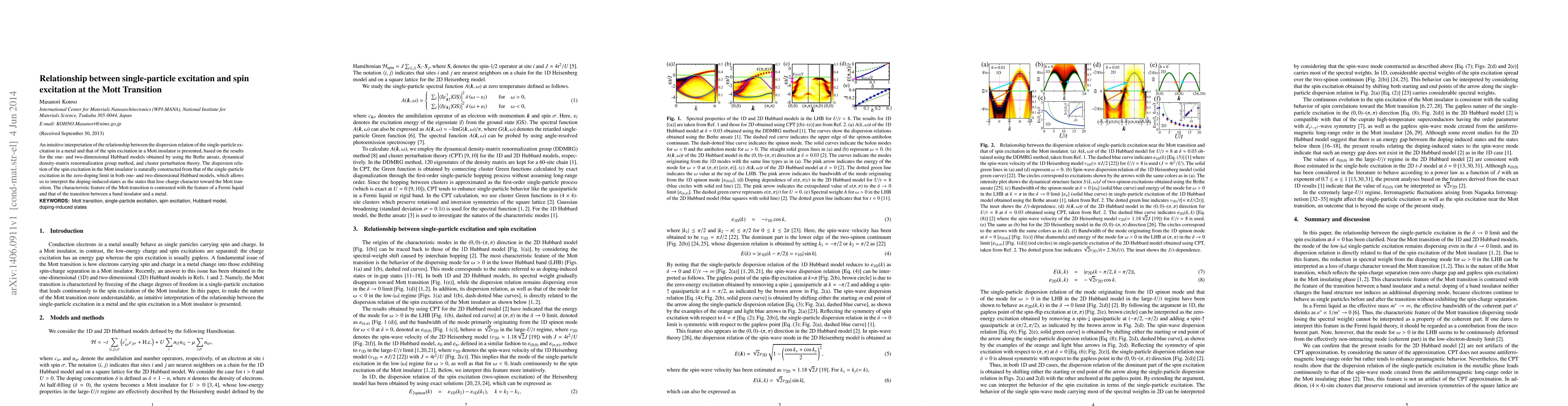 This paper explores the connection between single-particle and spin excitations across the Mott transition using the Hubbard models, revealing that spin excitations in Mott insulators are derived from single-particle excitations in the zero-doping limit, contrasting with Fermi liquid behavior and transitions between band insulators and metals.