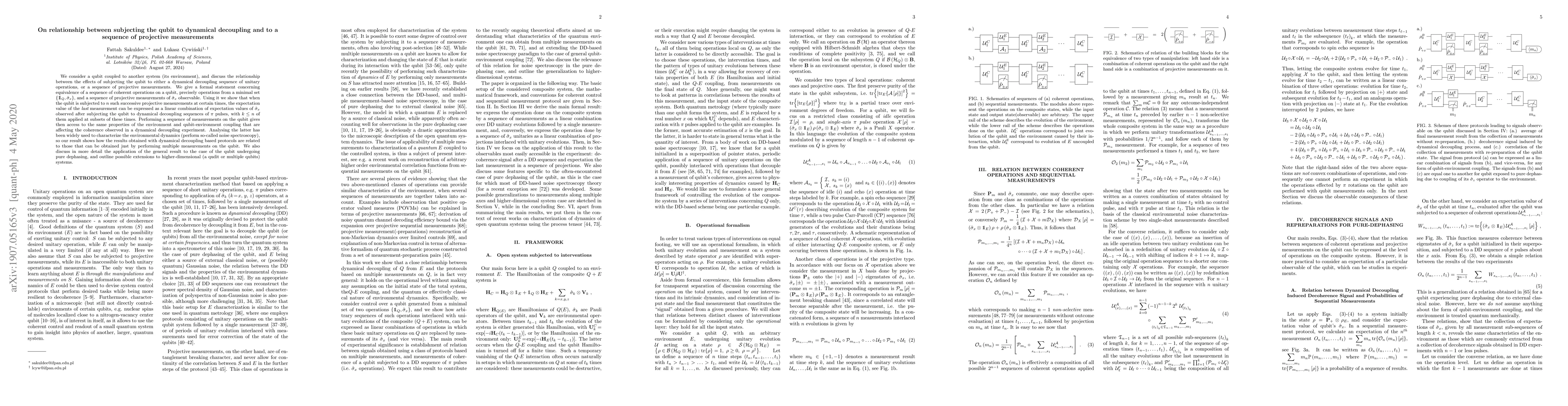 We consider a qubit coupled to another system (its environment), and discuss the relationship between the effects of subjecting the qubit to either a dynamical decoupling sequence of unitary operations, or a sequence of projective measurements. We give a formal statement concerning equivalence of a sequence of coherent operations on a qubit, precisely operations from a minimal set $\left\{\mathbf{I}_Q,\hat{\sigma}_x\right\}$, and a sequence of projective measurements of $\hat{\sigma}_x$ observable. Using it we show that when the qubit is subjected to $n$ such successive projective measurements at certain times, the expectation value of the {\it last} measurement can be expressed as a linear combination of expectation values of $\hat{\sigma}_x$ observed after subjecting the qubit to dynamical decoupling sequences of $\pi$ pulses, with $k\leq n$ of them applied at subsets of these times. Performing a sequence of measurements on the qubit gives then access to the same properties of the environment and qubit-environment coupling that are affecting the coherence observed in a dynamical decoupling experiment. Analysing the latter has been widely used to characterize the environmental dynamics (perform so-called noise spectroscopy), so our result shows how the results obtained with dynamical decoupling based protocols are related to those that can be obtained just by performing multiple measurements on the qubit. We also discuss in more detail the application of the general result to the case of the qubit undergoing pure dephasing, and outline possible extensions to higher-dimensional (a qudit or multiple qubits) systems.