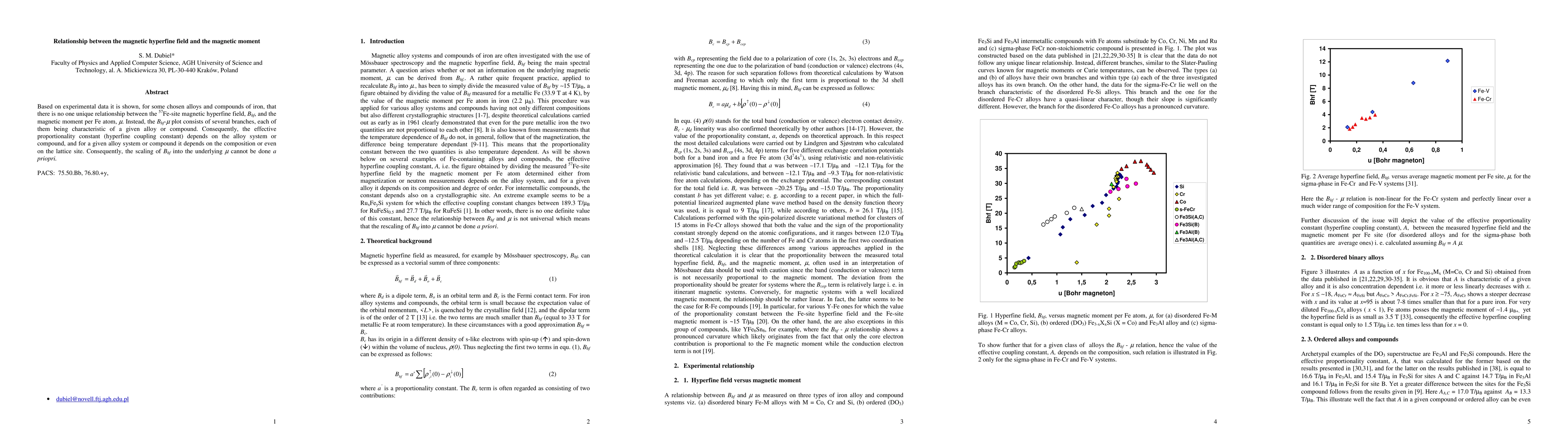 Summary: Experimental data reveals that the magnetic hyperfine field (Bhf) and magnetic moment (m) per Fe atom in selected iron alloys and compounds do not exhibit a single linear relationship; instead, multiple branches characterize different materials. The proportionality constant (hyperfine coupling constant) varies with the specific alloy or compound, and even within a given system, it can depend on composition and lattice site. Thus, Bhf cannot be universally scaled from m.
