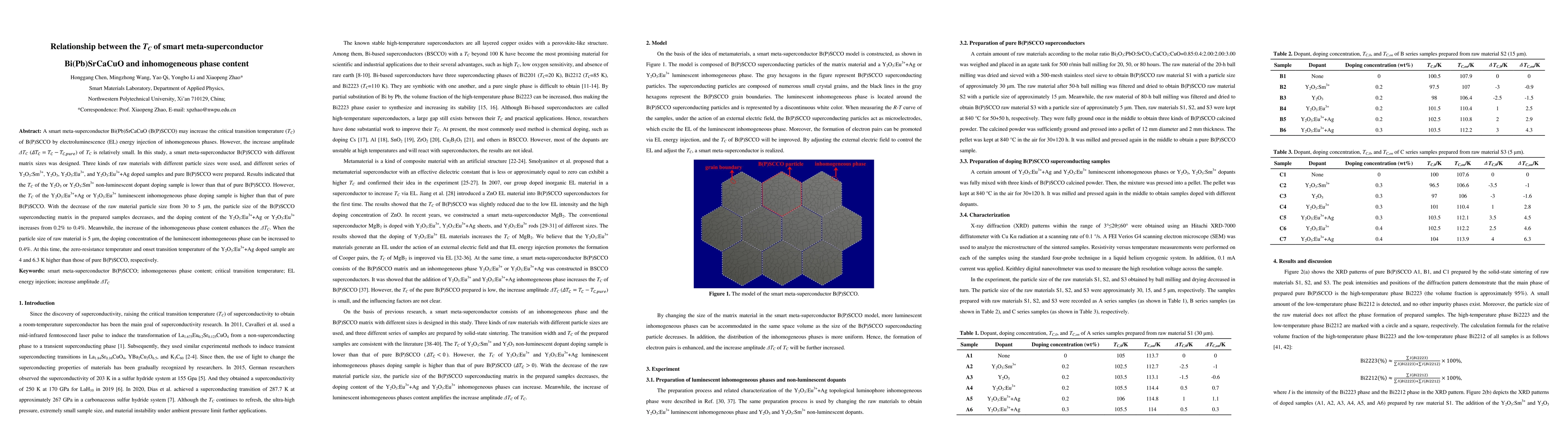 A smart meta-superconductor Bi(Pb)SrCaCuO (B(P)SCCO) may increase the critical transition temperature (TC) of B(P)SCCO by electroluminescence (EL) energy injection of inhomogeneous phases. However, the increase amplitude {\Delta}TC ({\Delta}TC=TC-T(C,pure)) of TC is relatively small. In this study, a smart meta-superconductor B(P)SCCO with different matrix sizes was designed. Three kinds of raw materials with different particle sizes were used, and different series of Y2O3:Sm3+, Y2O3, Y2O3:Eu3+, and Y2O3:Eu3++Ag doped samples and pure B(P)SCCO were prepared. Results indicated that the TC of the Y2O3 or Y2O3:Sm3+ non-luminescent dopant doping sample is lower than that of pure B(P)SCCO. However, the TC of the Y2O3:Eu3++Ag or Y2O3:Eu3+ luminescent inhomogeneous phase doping sample is higher than that of pure B(P)SCCO. With the decrease of the raw material particle size from 30 to 5 {\mu}m, the particle size of the B(P)SCCO superconducting matrix in the prepared samples decreases, and the doping content of the Y2O3:Eu3++Ag or Y2O3:Eu3+ increases from 0.2% to 0.4%. Meanwhile, the increase of the inhomogeneous phase content enhances the {\Delta}TC. When the particle size of raw material is 5 {\mu}m, the doping concentration of the luminescent inhomogeneous phase can be increased to 0.4%. At this time, the zero-resistance temperature and onset transition temperature of the Y2O3:Eu3++Ag doped sample are 4 and 6.3 K higher than those of pure B(P)SCCO, respectively.