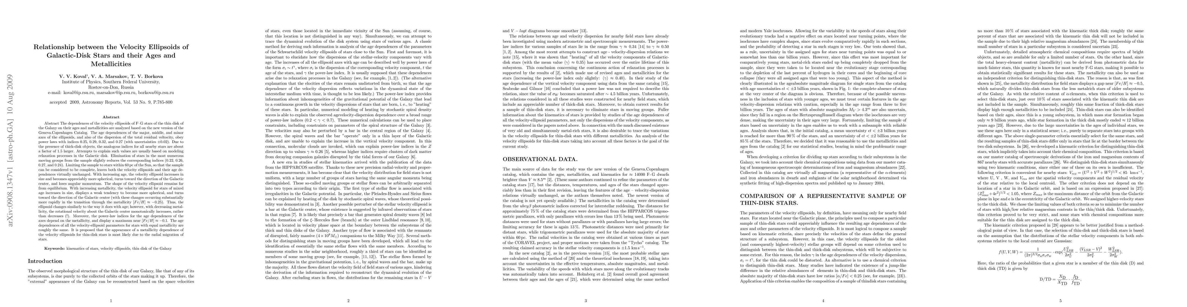 This paper analyzes the relationship between the velocity ellipsoids of F-G stars in the Galactic disk and their ages and metallicities, revealing that these ellipsoids follow power-law dependencies with age and metallicity, with significant variations due to radial migration and the presence of thick-disk objects. The study suggests that the velocity ellipsoids become more spherical and oriented towards the Galactic center with increasing age and metallicity.