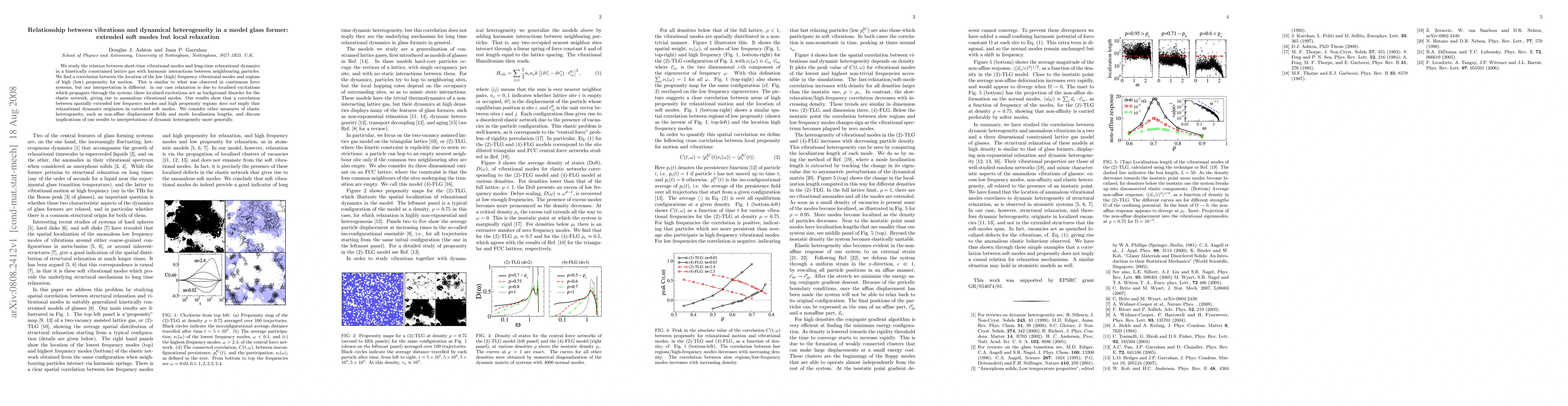 We study the relation between short-time vibrational modes and long-time relaxational dynamics in a kinetically constrained lattice gas with harmonic interactions between neighbouring particles. We find a correlation between the location of the low (high) frequency vibrational modes and regions of high (low) propensity for motion. This is similar to what was observed in continuous force systems, but our interpretation is different: in our case relaxation is due to localised excitations which propagate through the system; these localised excitations act as background disorder for the elastic network, giving rise to anomalous vibrational modes. Our results show that a correlation between spatially extended low frequency modes and high propensity regions does not imply that relaxational dynamics originates in extended soft modes. We consider other measures of elastic heterogeneity, such as non-affine displacement fields and mode localisation lengths, and discuss implications of our results to interpretations of dynamic heterogeneity more generally.