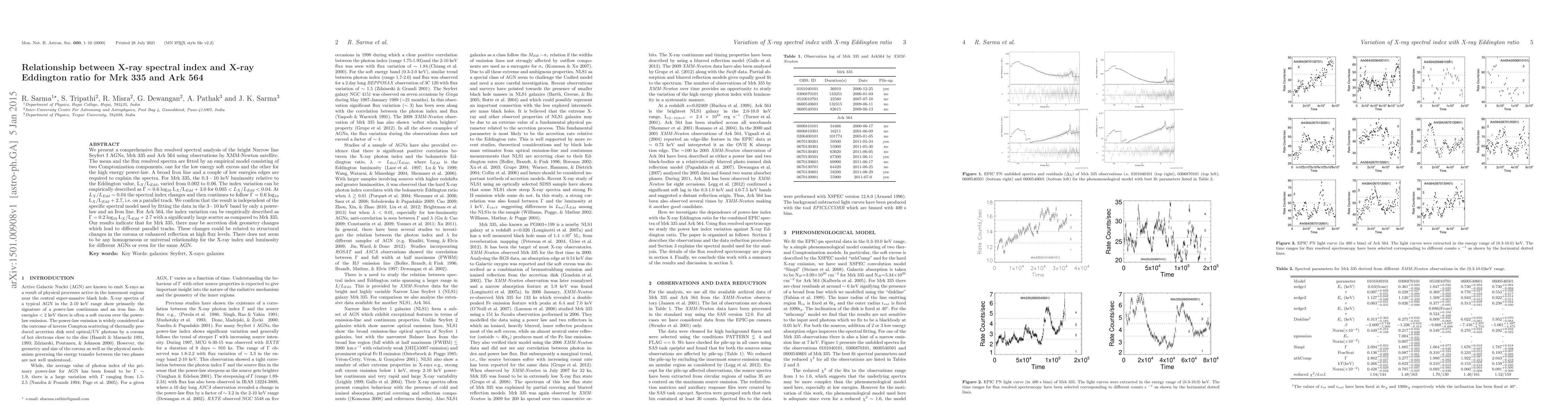 This paper investigates the relationship between the X-ray spectral index and the X-ray Eddington ratio for the AGNs Mrk 335 and Ark 564 using XMM-Newton data. It finds distinct empirical relationships for each AGN, suggesting no universal correlation, and proposes that variations in Mrk 335's spectral index may be due to changes in accretion disk geometry or corona structure.