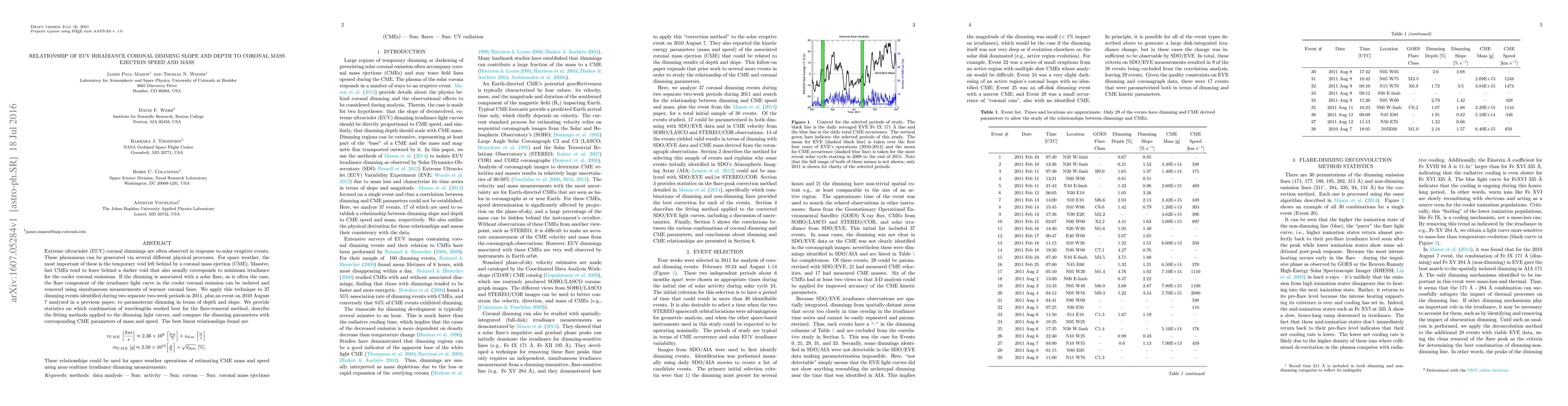 This paper investigates the relationship between extreme ultraviolet (EUV) coronal dimming slope and depth and the speed and mass of coronal mass ejections (CMEs). It finds linear correlations that can estimate CME mass and speed using real-time irradiance dimming measurements for space weather forecasting.