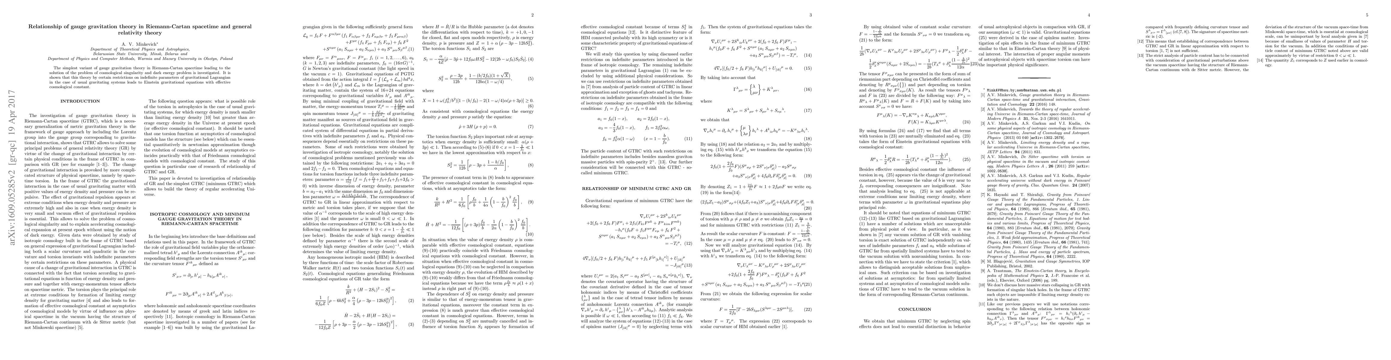 The simplest variant of gauge gravitation theory in Riemann-Cartan spacetime leading to the solution of the problem of cosmological singularity and dark energy problem is investigated. It is shown that this theory by certain restrictions on indefinite parameters of gravitational Lagrangian in the case of usual gravitating systems leads to Einstein gravitational equations with effective cosmological constant.