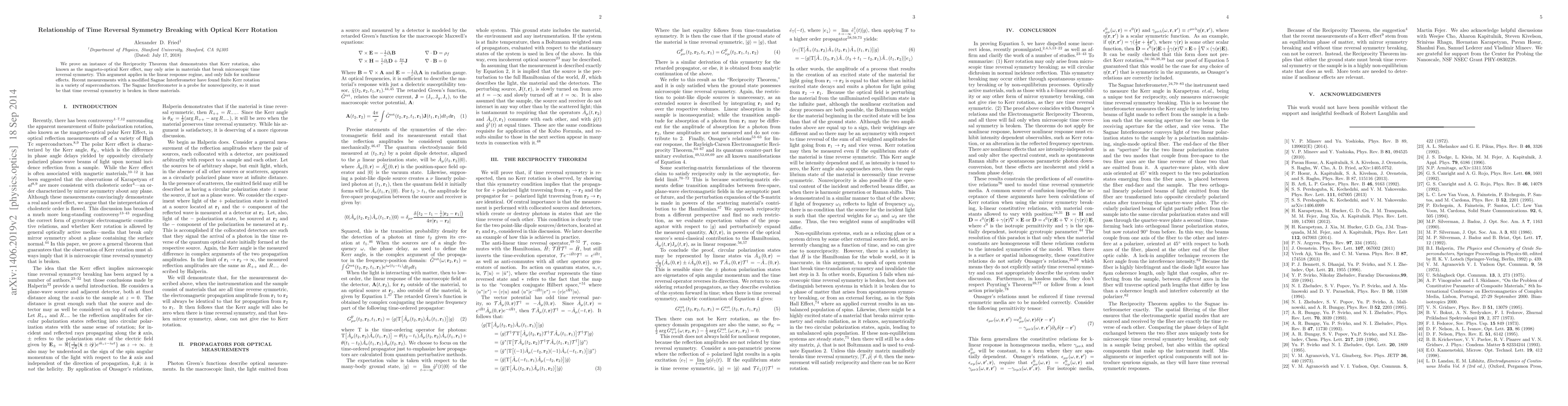 This paper proves that Kerr rotation, a magneto-optical effect, occurs only in materials with broken microscopic time reversal symmetry, applicable in linear response scenarios. Recent measurements in superconductors using a modified Sagnac Interferometer confirm this, indicating time reversal symmetry is indeed broken in these materials.