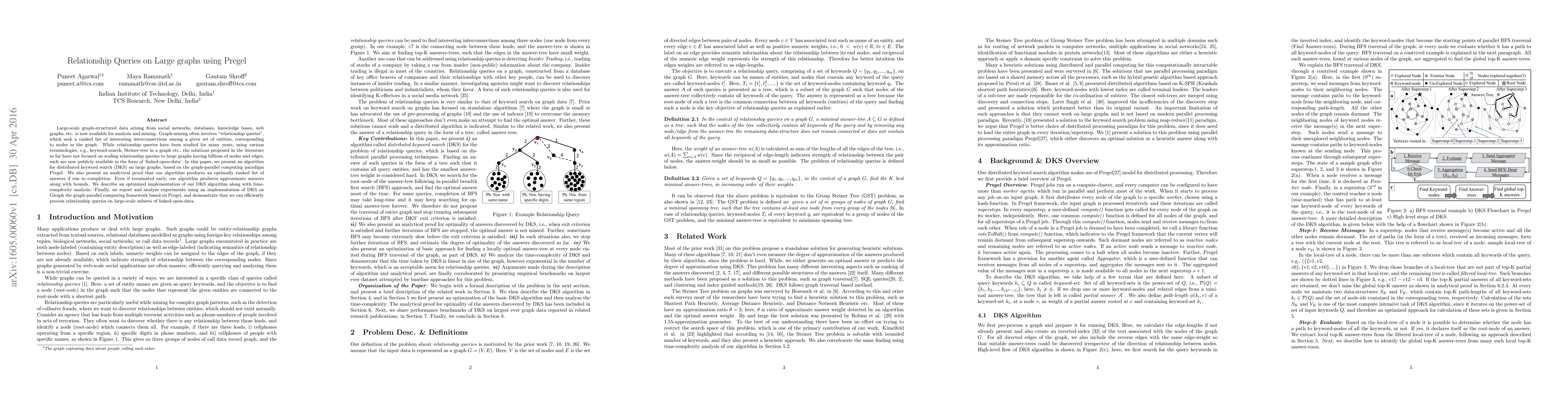 This paper proposes a distributed keyword search algorithm based on Pregel for efficiently scaling relationship queries on large graphs, providing both optimal and approximate results. Experiments using Giraph demonstrate effective processing of relationship queries on large-scale linked-open-data.
