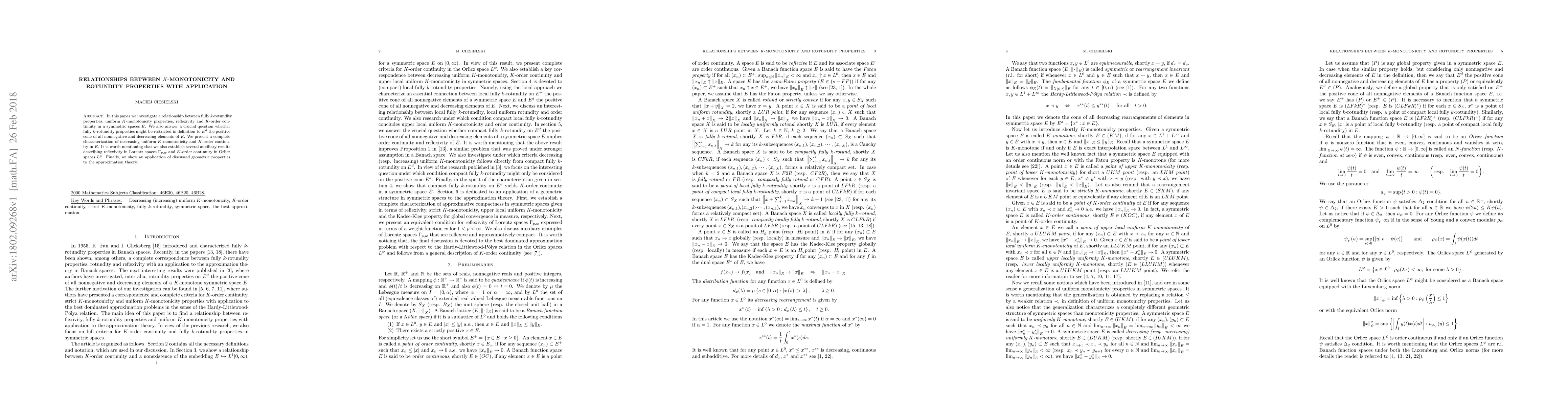 In this paper we investigate a relationship between fully k-rotundity properties, uniform K-monotonicity properties, reflexivity and K-order continuity in a symmetric spaces E. We also answer a crucial question whether fully k-rotundity properties might be restricted in definition to E^d the positive cone of all nonnegative and decreasing elements of E. We present a complete characterization of decreasing uniform K-monotonicity and K-order continuity in E. It is worth mentioning that we also establish several auxiliary results describing reflexivity in Lorentz spaces and K-order continuity in Orlicz spaces. Finally, we show an application of discussed geometric properties to the approximation theory.