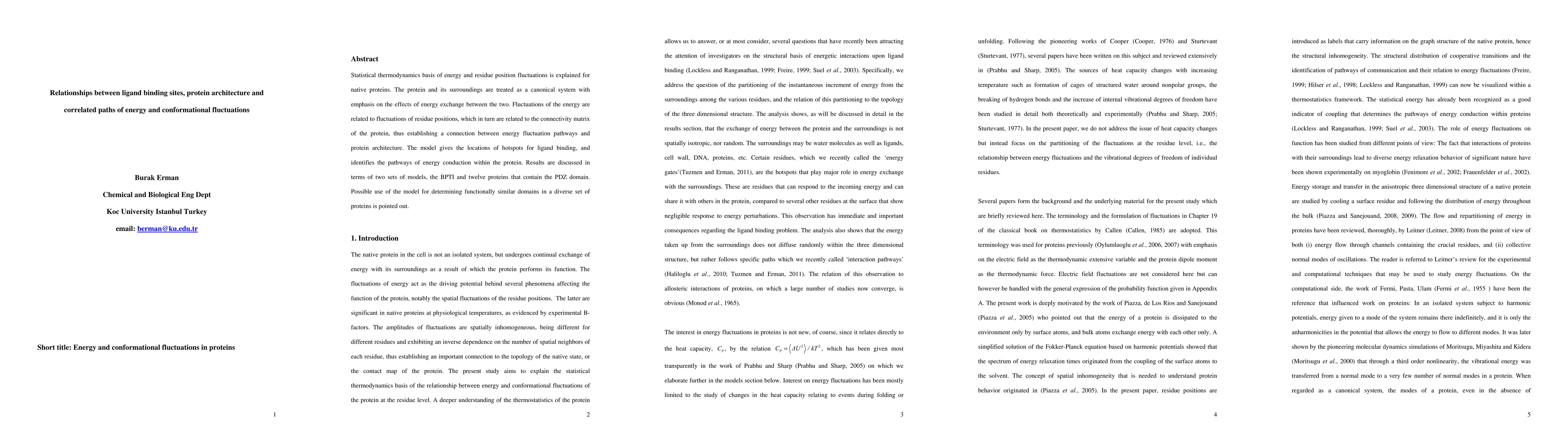 This paper establishes a statistical thermodynamics model linking ligand binding sites, protein architecture, and correlated energy and conformational fluctuations. It identifies hotspots for ligand binding and energy conduction pathways within proteins, using BPTI and PDZ domain proteins as examples, and suggests potential applications for identifying functionally similar domains.