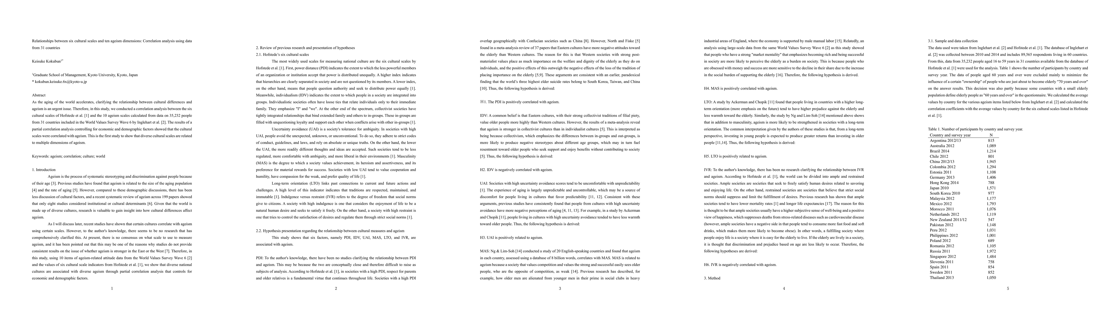 This study correlates six cultural dimensions from Hofstede et al. with ten ageism dimensions using data from 35,232 individuals across 31 countries. Findings reveal significant associations between cultural values and various ageism dimensions, highlighting the complex interplay between culture and age bias.