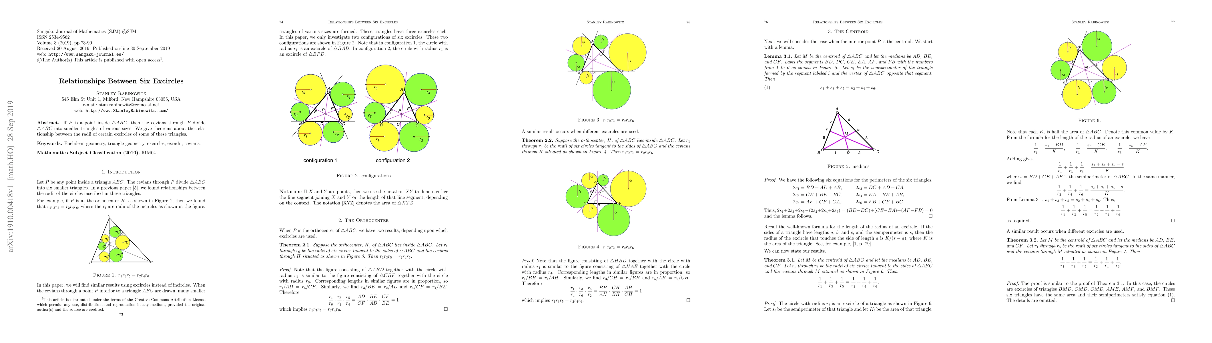 This paper explores the relationships between the radii of the excircles associated with smaller triangles formed by cevians passing through a point $P$ inside $\triangle ABC$. It presents theorems detailing these connections.