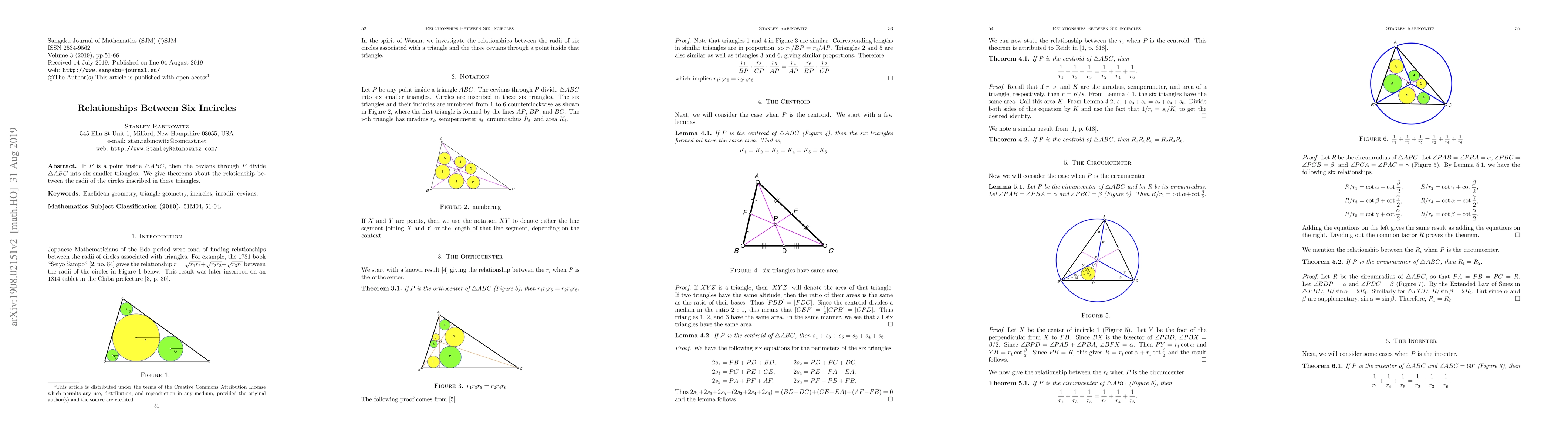 If P is a point inside triangle ABC, then the cevians through P divide triangle ABC into six smaller triangles. We give theorems about the relationship between the radii of the circles inscribed in these triangles.