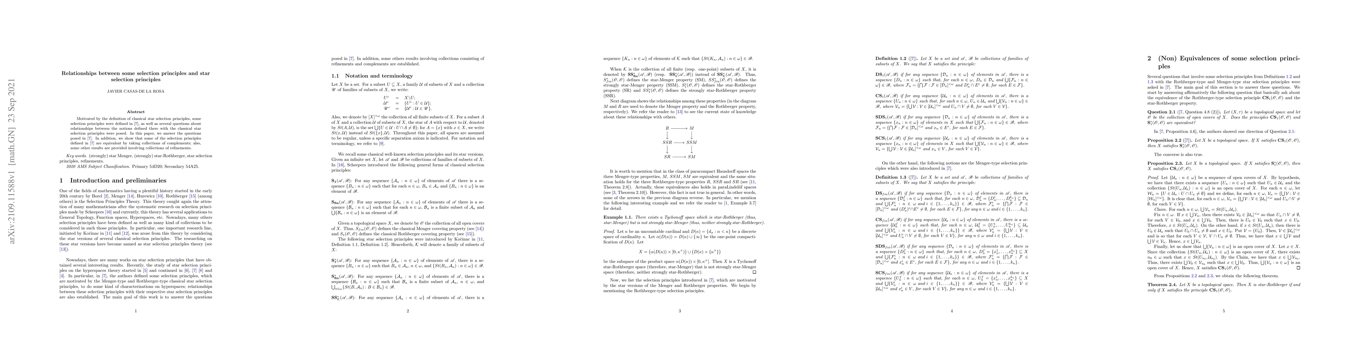 Motivated by the definition of classical star selection principles, Cruz-Castillo, Ram\'irez-P\'aramo and Tenorio defined some selection principles and posed several questions about relationships between these notions and some of the classical star selection principles. The main goal of this paper is to answer the questions posed by these authors. In addition, we show that some of these defined selection principles are equivalent by taking collections of complements; also, some other results are provided involving collections of refinements.