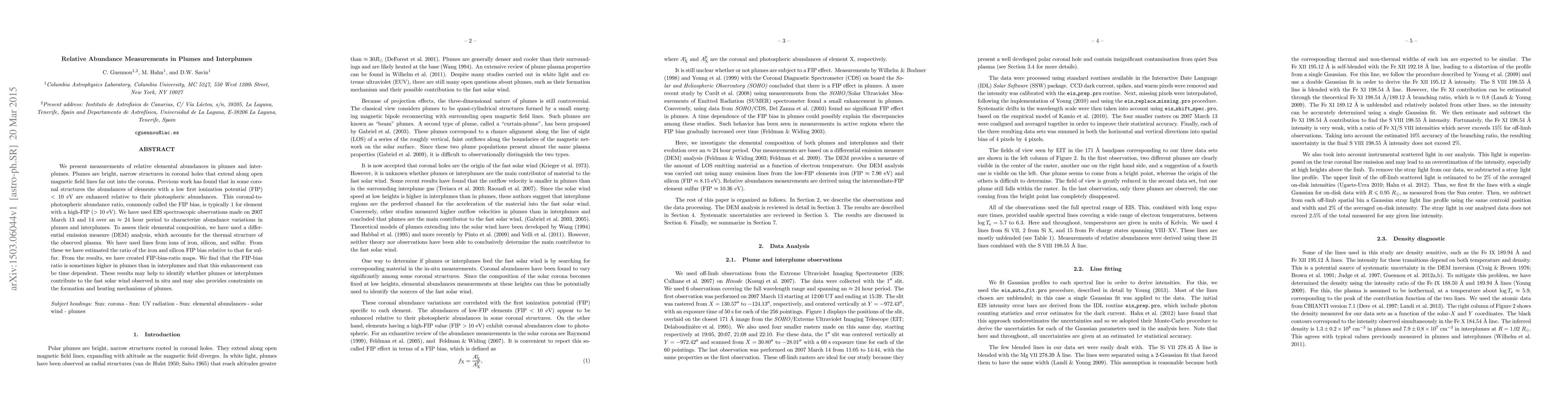 This study measures relative elemental abundances in solar coronal plumes and interplumes using EIS spectroscopic observations, revealing that plumes sometimes exhibit higher FIP-bias ratios compared to interplumes, suggesting a potential link to the fast solar wind and offering insights into plume formation and heating mechanisms.