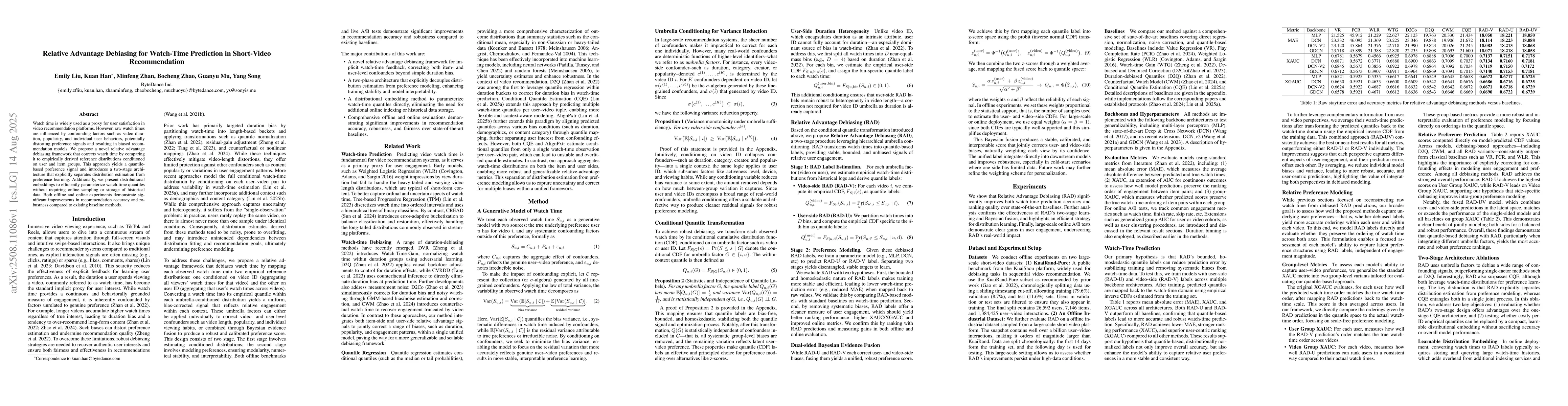 Watch time is widely used as a proxy for user satisfaction in video recommendation platforms. However, raw watch times are influenced by confounding factors such as video duration, popularity, and individual user behaviors, potentially distorting preference signals and resulting in biased recommendation models. We propose a novel relative advantage debiasing framework that corrects watch time by comparing it to empirically derived reference distributions conditioned on user and item groups. This approach yields a quantile-based preference signal and introduces a two-stage architecture that explicitly separates distribution estimation from preference learning. Additionally, we present distributional embeddings to efficiently parameterize watch-time quantiles without requiring online sampling or storage of historical data. Both offline and online experiments demonstrate significant improvements in recommendation accuracy and robustness compared to existing baseline methods.