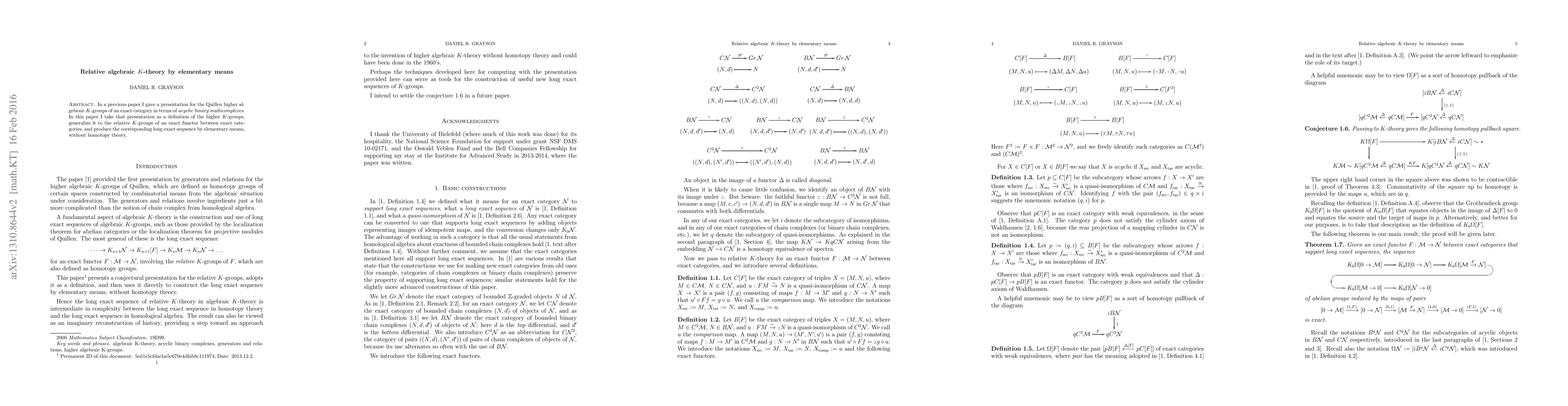 In a previous paper I gave a presentation for the Quillen higher algebraic K-groups of an exact category in terms of "acyclic binary multicomplexes". In this paper I take that presentation as a definition of the higher K-groups, generalize it to the relative K-groups of an exact functor between exact categories, and produce the corresponding long exact sequence by elementary means, without homotopy theory.