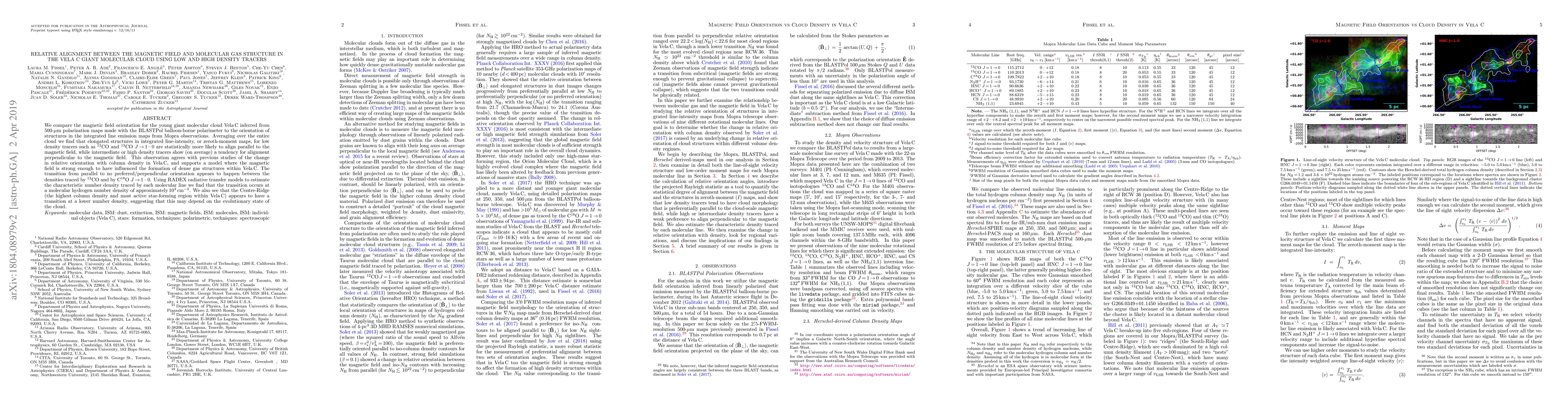 We compare the magnetic field orientation for the young giant molecular cloud Vela C inferred from 500-$\mu$m polarization maps made with the BLASTPol balloon-borne polarimeter to the orientation of structures in the integrated line emission maps from Mopra observations. Averaging over the entire cloud we find that elongated structures in integrated line-intensity, or zeroth-moment maps, for low density tracers such as $^{12}$CO and $^{13}$CO $J$ $\rightarrow$ 1 - 0 are statistically more likely to align parallel to the magnetic field, while intermediate or high density tracers show (on average) a tendency for alignment perpendicular to the magnetic field. This observation agrees with previous studies of the change in relative orientation with column density in Vela C, and supports a model where the magnetic field is strong enough to have influenced the formation of dense gas structures within Vela C. The transition from parallel to no preferred/perpendicular orientation appears to happen between the densities traced by $^{13}$CO and by C$^{18}$O $J$ $\rightarrow$ 1 - 0. Using RADEX radiative transfer models to estimate the characteristic number density traced by each molecular line we find that the transition occurs at a molecular hydrogen number density of approximately $10^3$ cm$^{-3}$. We also see that the Centre-Ridge (the highest column density and most active star-forming region within Vela C) appears to have a transition at a lower number density, suggesting that this may depend on the evolutionary state of the cloud.