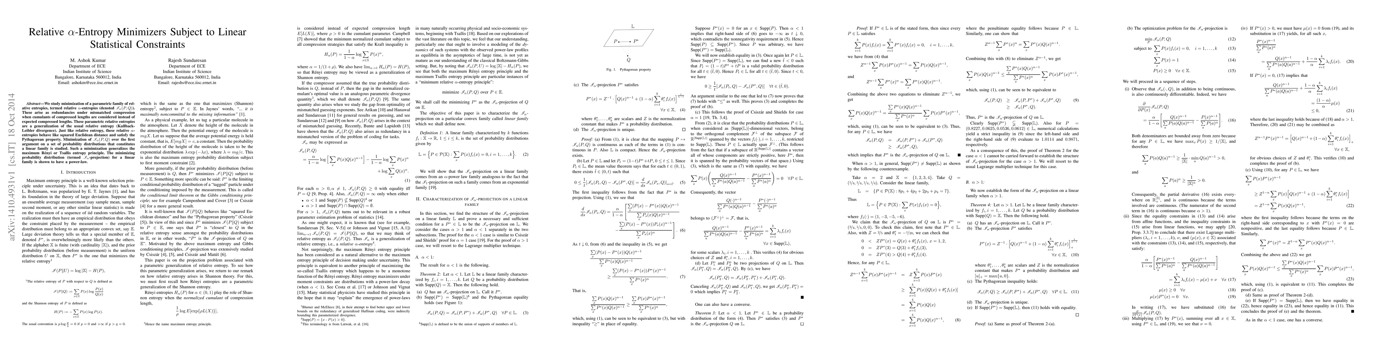 We study minimization of a parametric family of relative entropies, termed relative $\alpha$-entropies (denoted $\mathscr{I}_{\alpha}(P,Q)$). These arise as redundancies under mismatched compression when cumulants of compressed lengths are considered instead of expected compressed lengths. These parametric relative entropies are a generalization of the usual relative entropy (Kullback-Leibler divergence). Just like relative entropy, these relative $\alpha$-entropies behave like squared Euclidean distance and satisfy the Pythagorean property. Minimization of $\mathscr{I}_{\alpha}(P,Q)$ over the first argument on a set of probability distributions that constitutes a linear family is studied. Such a minimization generalizes the maximum R\'{e}nyi or Tsallis entropy principle. The minimizing probability distribution (termed $\mathscr{I}_{\alpha}$-projection) for a linear family is shown to have a power-law.