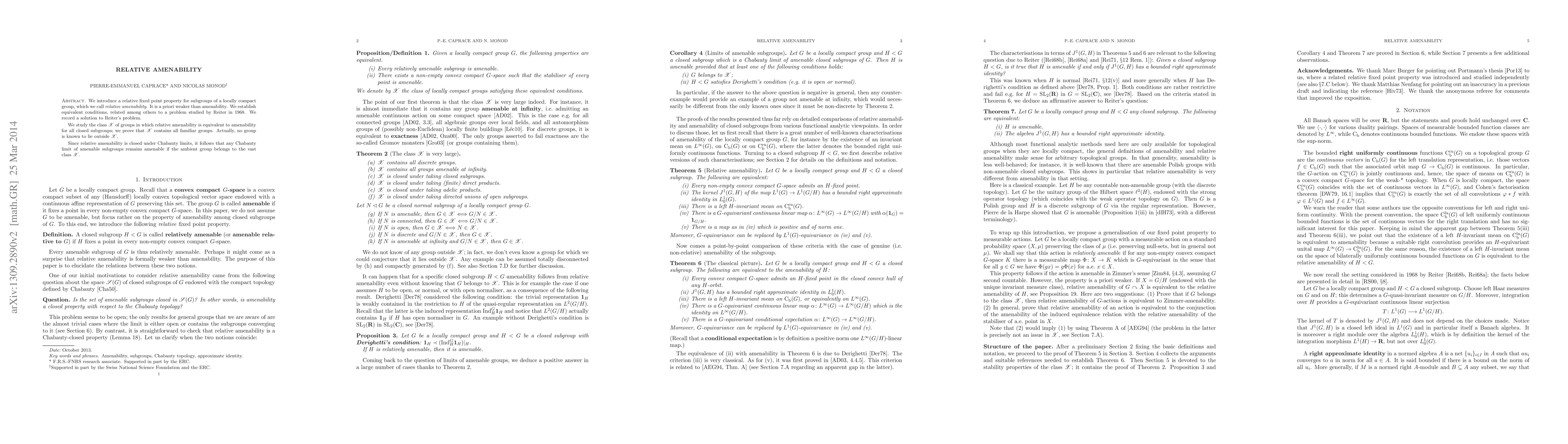 We introduce a relative fixed point property for subgroups of a locally compact group, which we call relative amenability. It is a priori weaker than amenability. We establish equivalent conditions, related among others to a problem studied by Reiter in 1968. We record a solution to Reiter's problem. We study the class X of groups in which relative amenability is equivalent to amenability for all closed subgroups; we prove that X contains all familiar groups. Actually, no group is known to lie outside X. Since relative amenability is closed under Chabauty limits, it follows that any Chabauty limit of amenable subgroups remains amenable if the ambient group belongs to the vast class X.