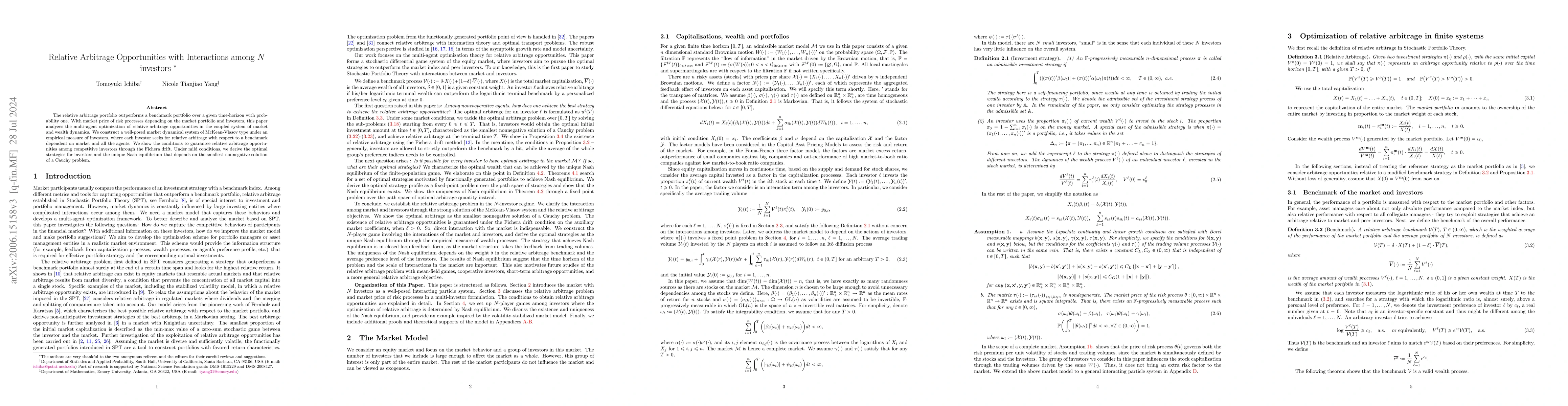 Researchers analyzed market behavior and investment strategies to identify relative arbitrage opportunities in N investors and mean-field regimes, finding a unique equilibrium with mild conditions on equity markets.