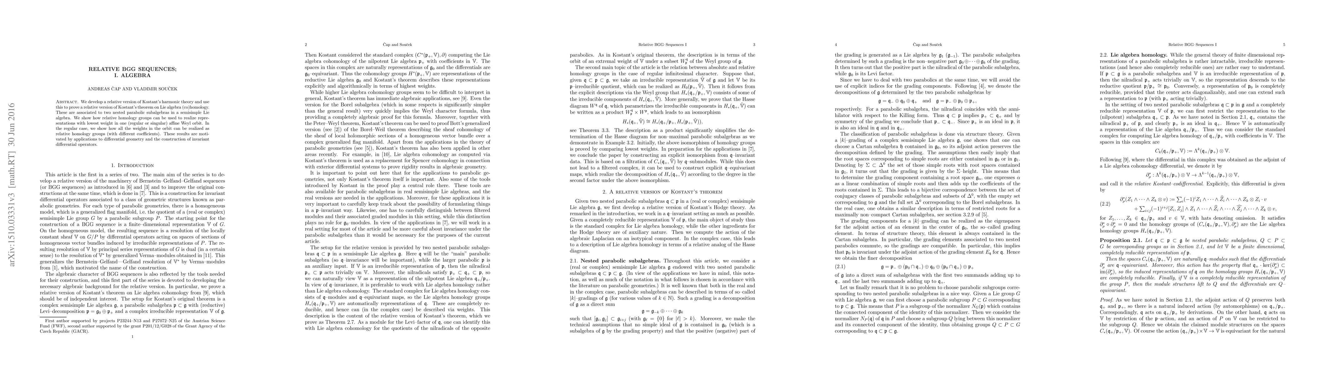 We develop a relative version of Kostant's harmonic theory and use this to prove a relative version of Kostant's theorem on Lie algebra (co)homology. These are associated to two nested parabolic subalgebras in a semisimple Lie algebra. We show how relative homology groups can be used to realize representations with lowest weight in one (regular or singular) affine Weyl orbit. In the regular case, we show how all the weights in the orbit can be realized as relative homology groups (with different coefficients). These results are motivated by applications to differential geometry and the construction of invariant differential operators.