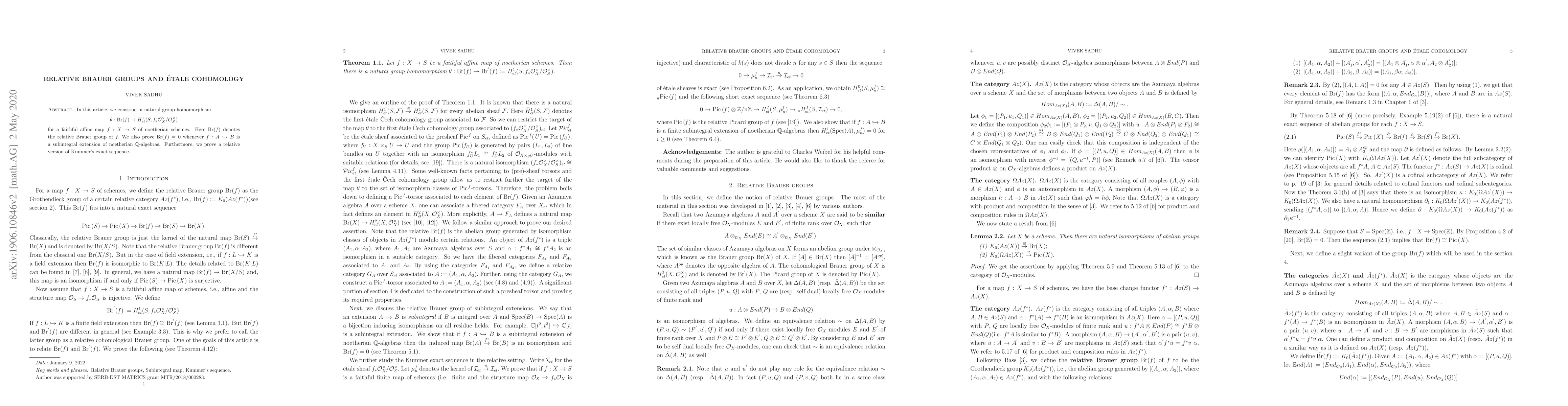 This paper constructs a group homomorphism from the relative Brauer group of a faithful affine map between noetherian schemes to \'etale cohomology, and explores the behavior of Brauer groups in subintegral maps, along with proving a relative Kummer's exact sequence.