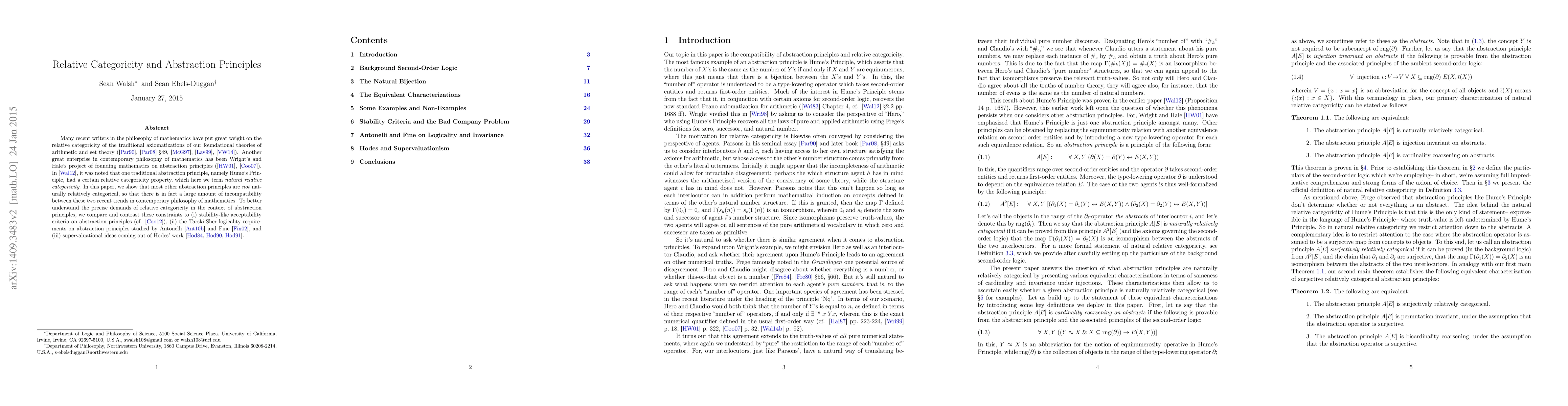 Many recent writers in the philosophy of mathematics have put great weight on the relative categoricity of the traditional axiomatizations of our foundational theories of arithmetic and set theory (\cite{Parsons1990a}, \cite{Parsons2008} \S{49}, \cite{McGee1997aa}, \cite{Lavine1999aa}, \cite{Vaananen2014aa}). Another great enterprise in contemporary philosophy of mathematics has been Wright's and Hale's project of founding mathematics on abstraction principles (\cite{Hale2001}, \cite{Cook2007aa}). In \cite{Walsh2012aa}, it was noted that one traditional abstraction principle, namely Hume's Principle, had a certain relative categoricity property, which here we term \emph{natural relative categoricity}. In this paper, we show that most other abstraction principles are \emph{not} naturally relatively categorical, so that there is in fact a large amount of incompatibility between these two recent trends in contemporary philosophy of mathematics. To better understand the precise demands of relative categoricity in the context of abstraction principles, we compare and contrast these constraints to (i) stability-like acceptability criteria on abstraction principles (cf. \cite{Cook2012aa}), (ii) the Tarski-Sher logicality requirements on abstraction principles studied by Antonelli \cite{Antonelli2010aa} and Fine~\cite{Fine2002}, and (iii) supervaluational ideas coming out of Hodes' work \cite{Hodes1984, Hodes1990aa, Hodes1991}.